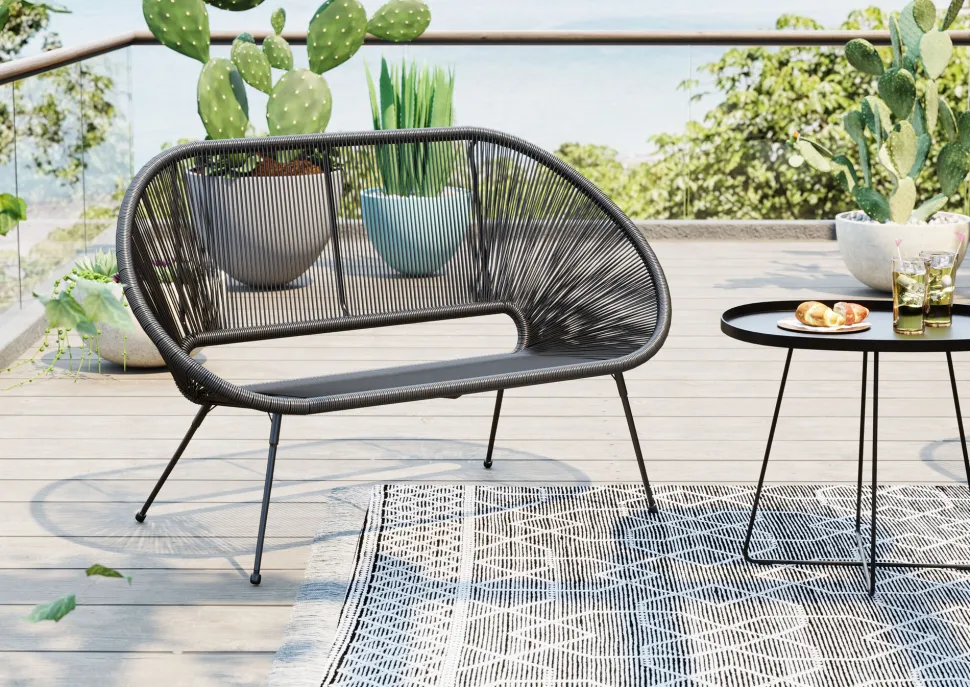 - Schwarze Sitzbank im Acapulco-Stil für drinnen und draußen, 81 x 121 x 71 Zentimeter (H/B/T)