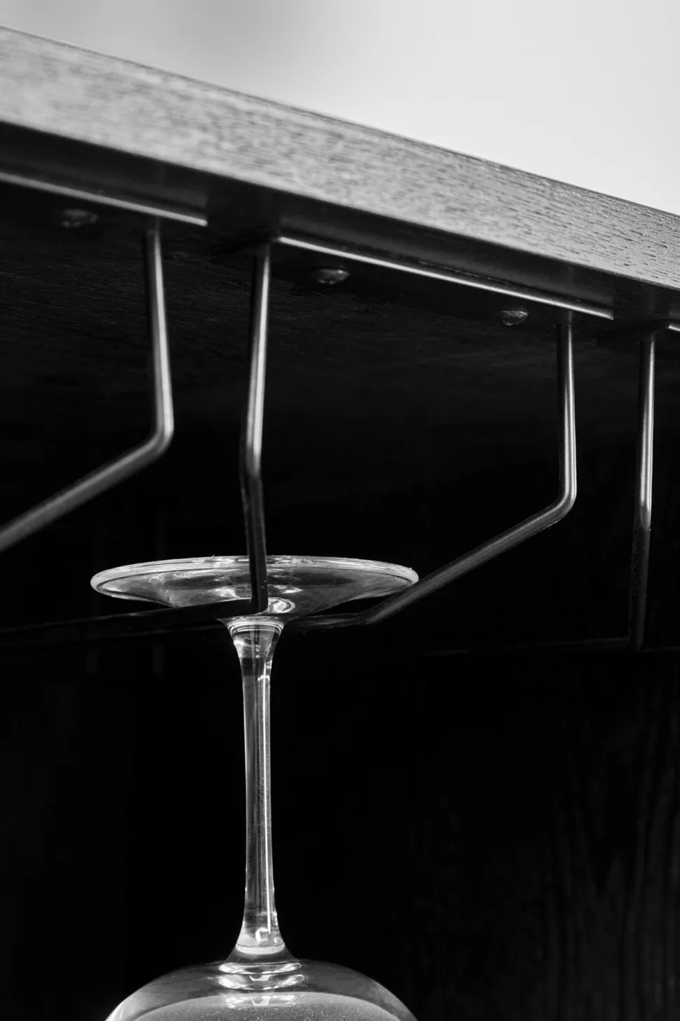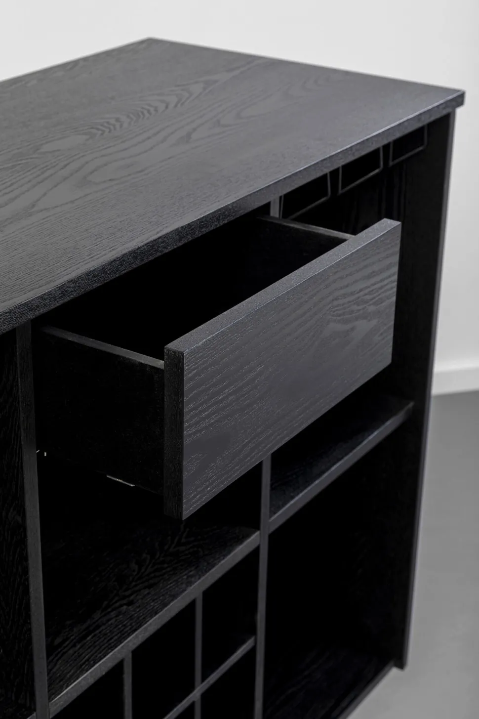 - Korpus und Gestell der Hausbar sind aus Esche-Furnierholz