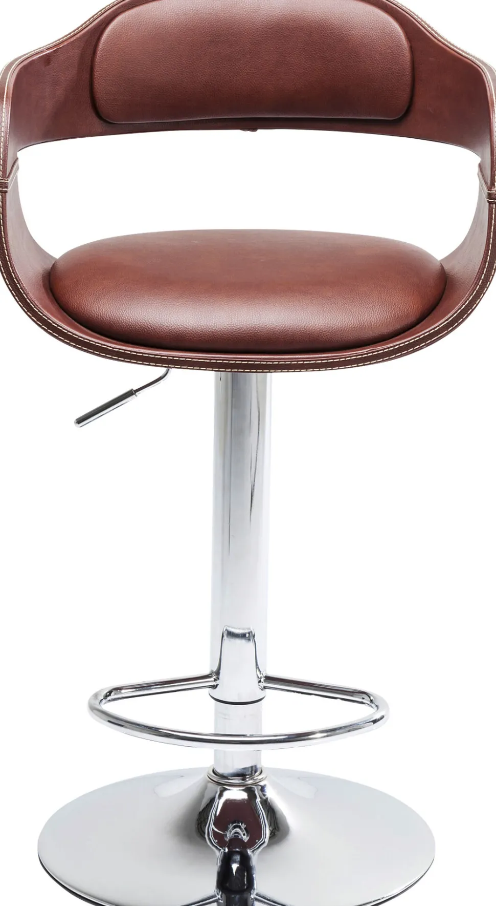 - Höhenverstellbarer Barhocker mit rundem, chromfarbenem Stahl-Fuß, nougatfarbenem Bezug im Vintage-Leder-Look und einer Fußstütze