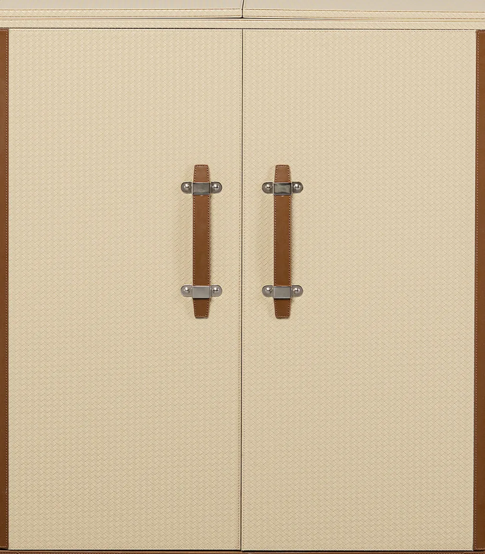 - Beigefarbene Hausbar im Design eines Vintage Reisekoffers mit einem Innenleben aus Esche-Holz