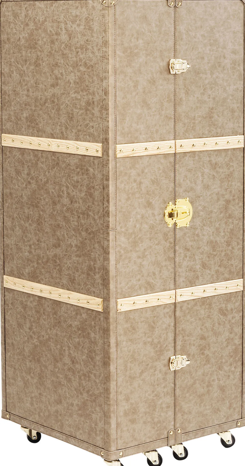 - Rechteckige, mannshohe Schrankkofferbar mit Nietendetails, Beschlägen aus Metall und braunem, pflegeleichtem Bezug aus beschichtetem Textil in Vintage-Leder-Optik