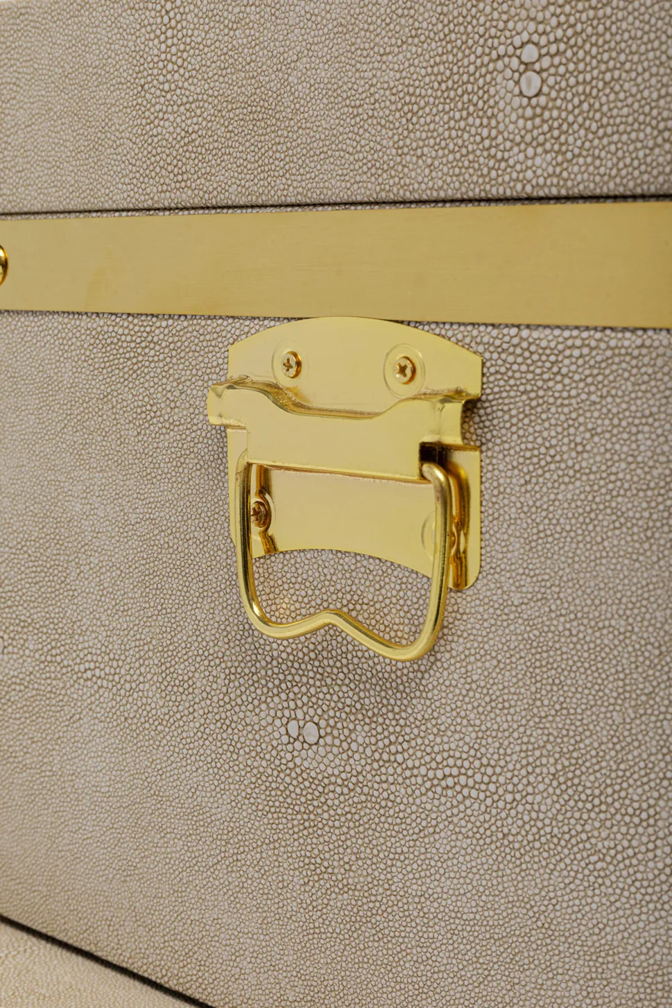 - Die beigefarbenen Boxen sind mit beschichtetem Textil in Rochenhaut-Optik bezogen