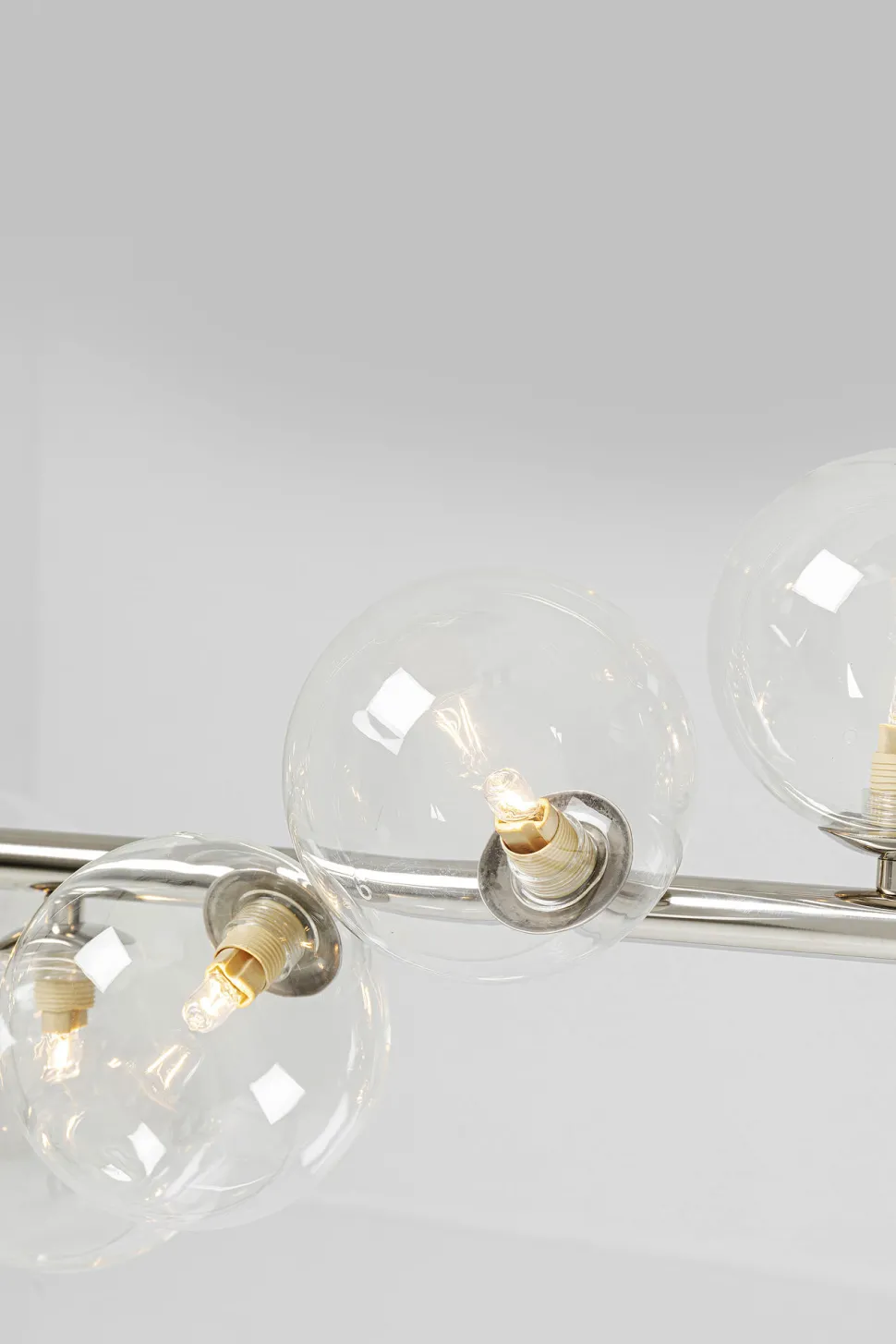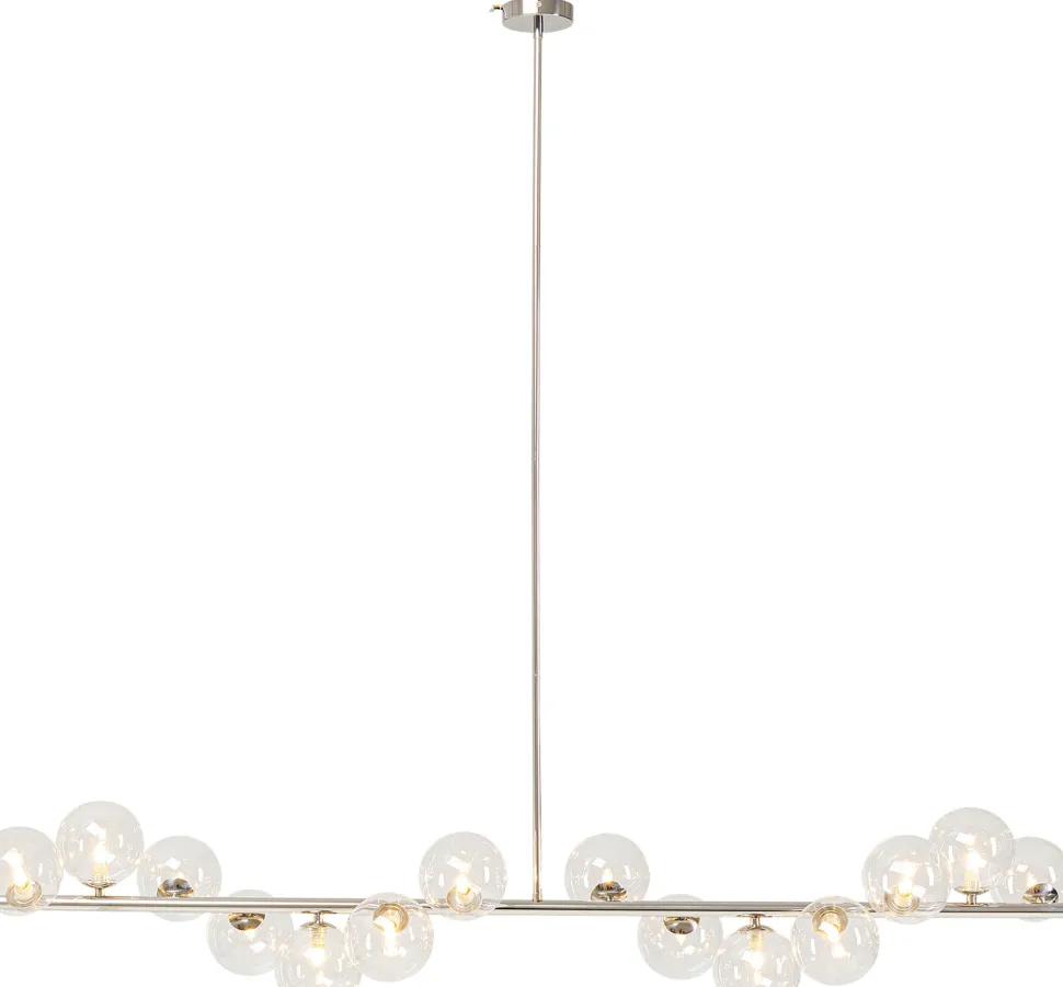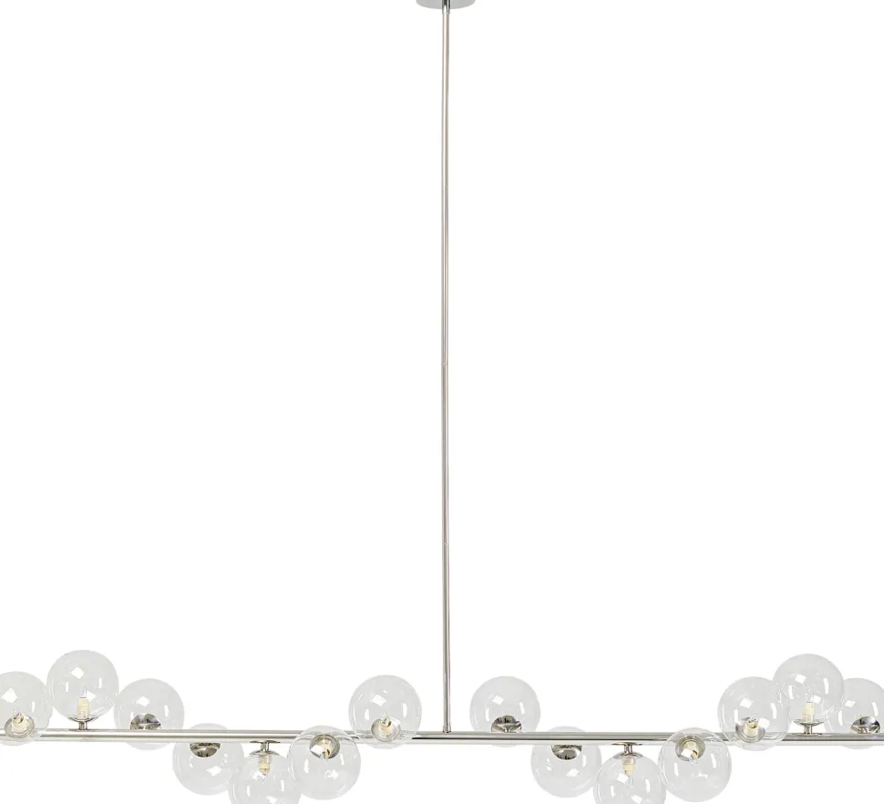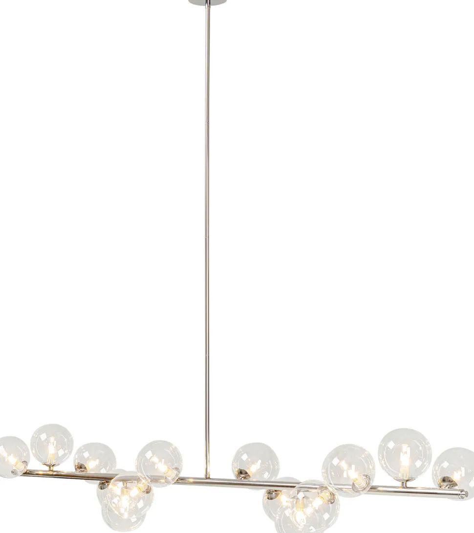 - Große, edle Hängeleuchte im Querformat mit einem silberfarbenen Gestell und 14 Leuchtenschirmen aus Glas