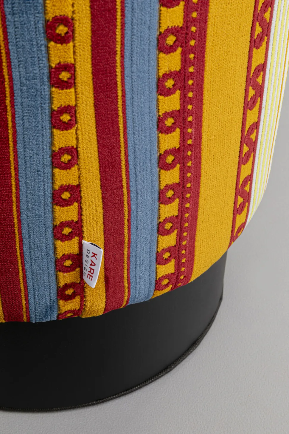 - Runder Polsterhocker mit buntem Muster und schwarzem Sockel, 38 x 32 x 32 Zentimeter (H/B/T)