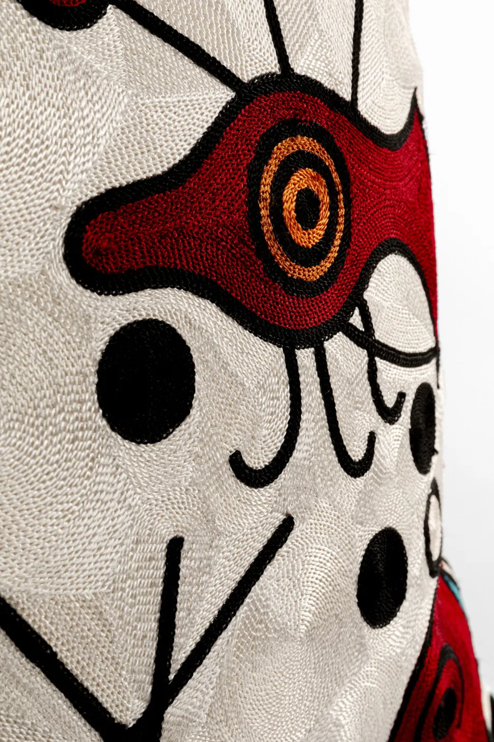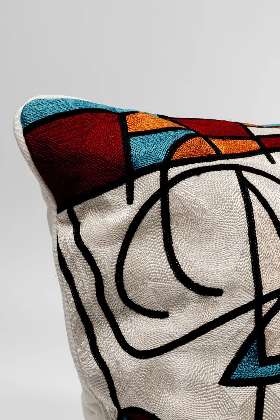 - Die Details in Schwarz und satten Farben wie Türkis und Rot kommen auf dem Beigen Kissen besonders zur Geltung