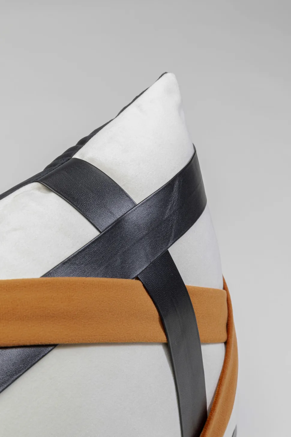 - Das Kissen überzeugt mit symmetrischen Bespannungen in glänzender und Velours-Lederoptik in natürlichen Tönen