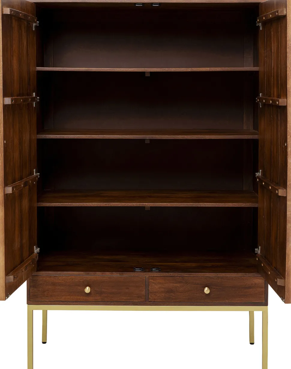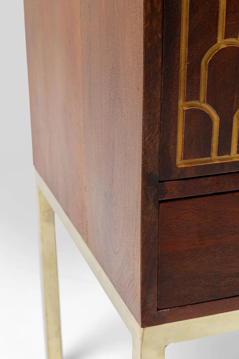 - Mannshoher Schrank aus Mango-Massivholz mit eingravierten, orientalischen Gold-Verzierungen, messingfarbenen Stahl-Beinen und vier Ablageflächen