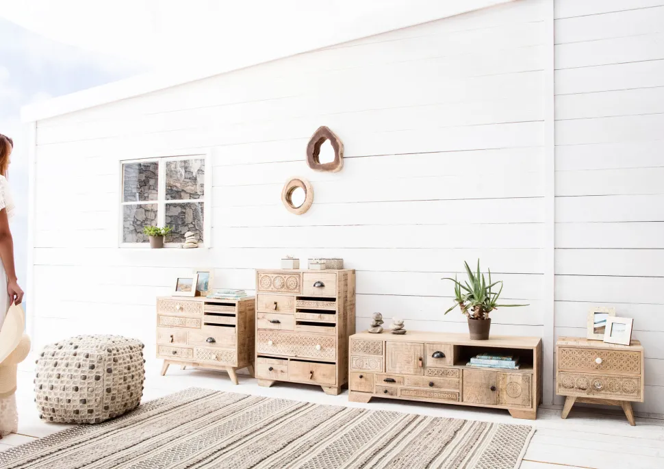 - Im Ethno-Look: handgefertigte, kleine Kommode aus Mango-Echtholz mit dekorativen Schnitzereien und zwei Schüben