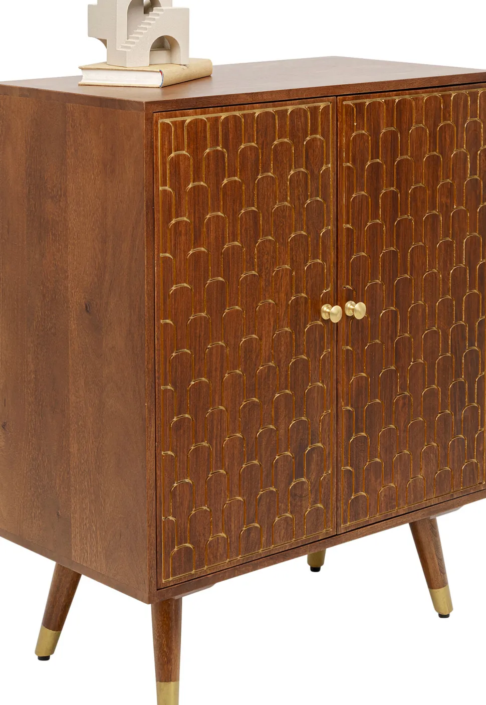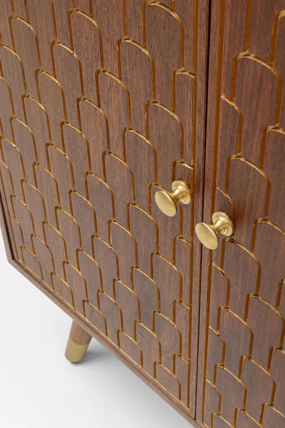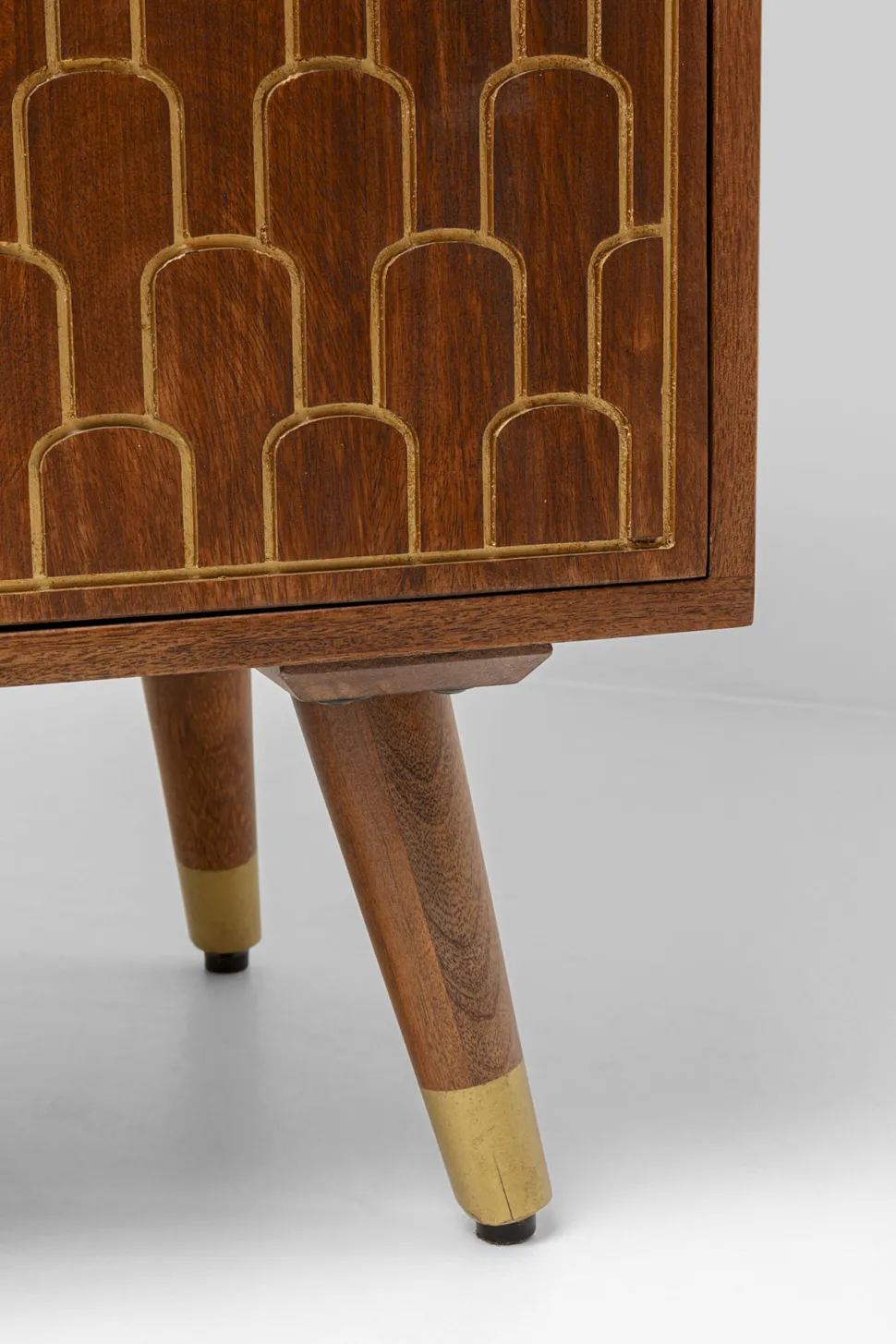 - Handgefertigte, kompakte Kommode aus Mango-Massivholz mit grafisch verzierten Fronten und handgemalten goldenen Details