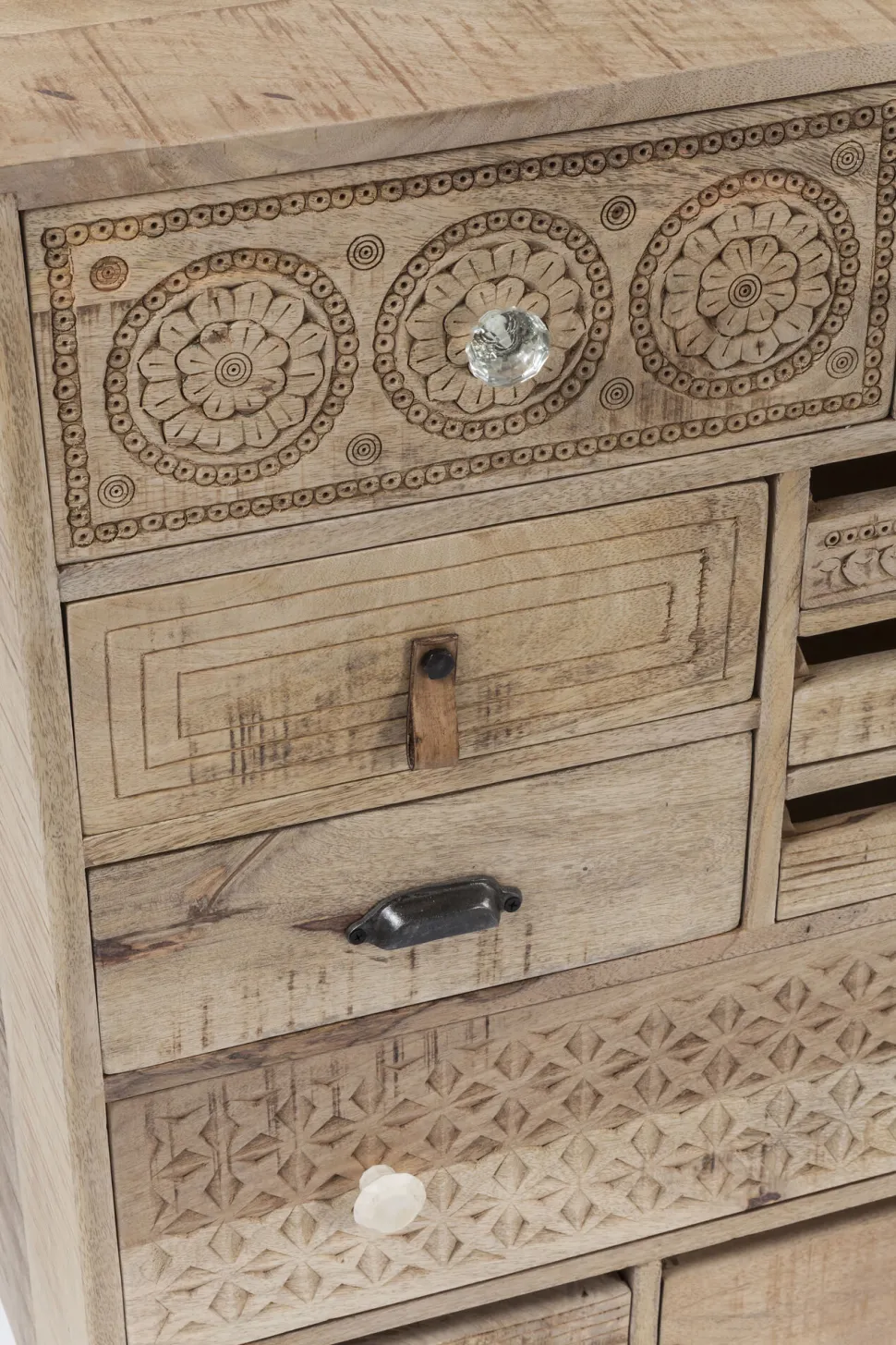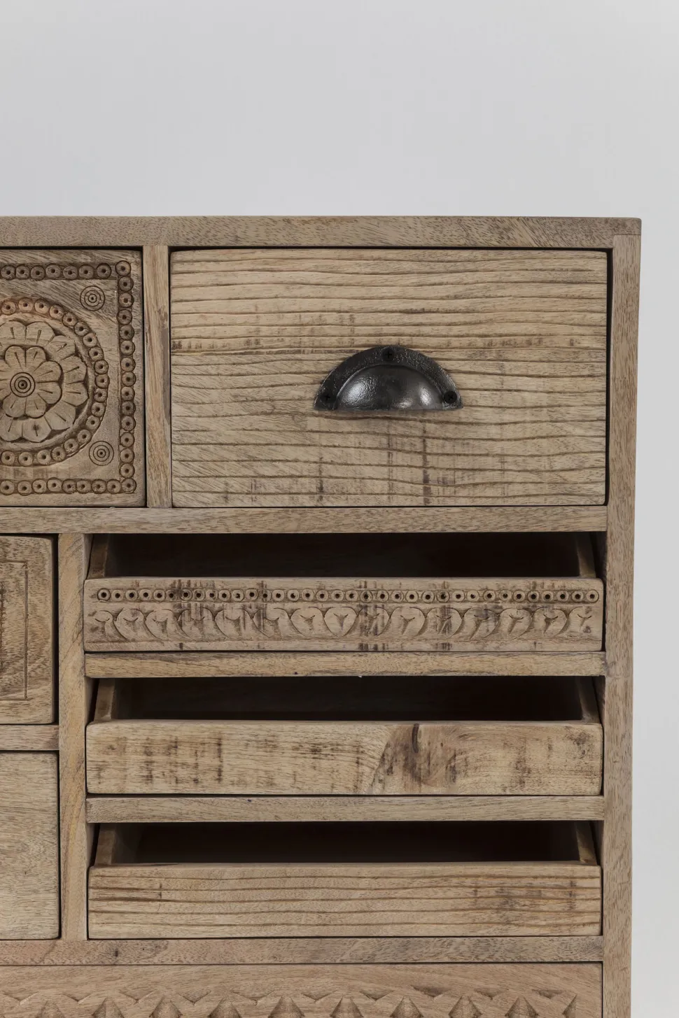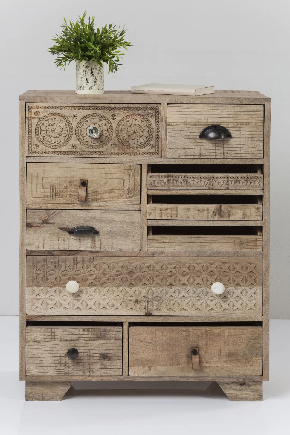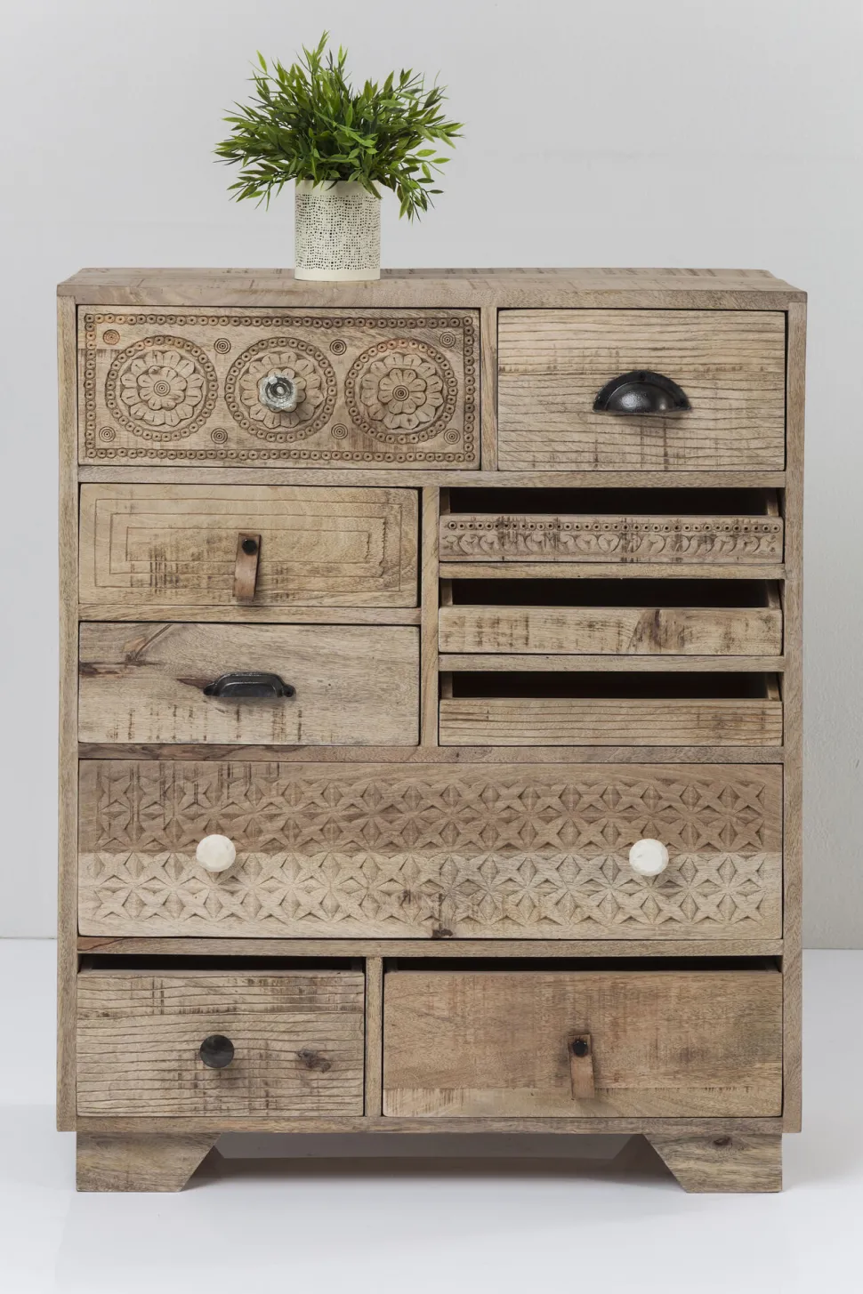 - Handgefertigte Kommode aus Mango-Massivholz mit dekorativen Schnitzereien und zehn Schüben mit individuellen Fronten