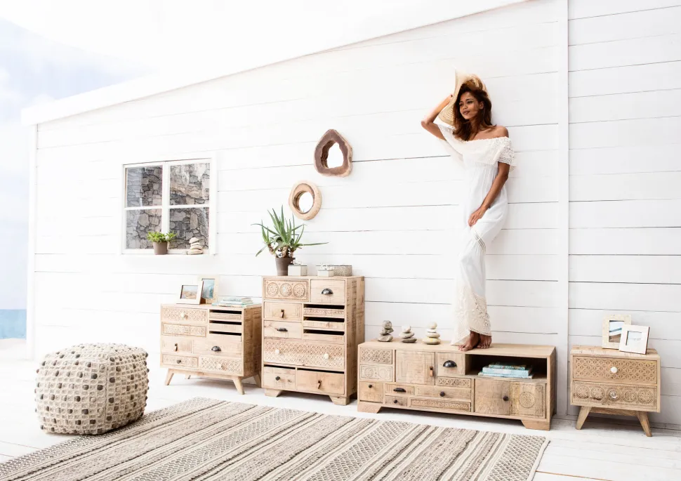- Der helle Holz-Ton sorgt für einen natürlichen Wohnstil, die raffinierten Ornamente für einen stylischen Ethno Look
