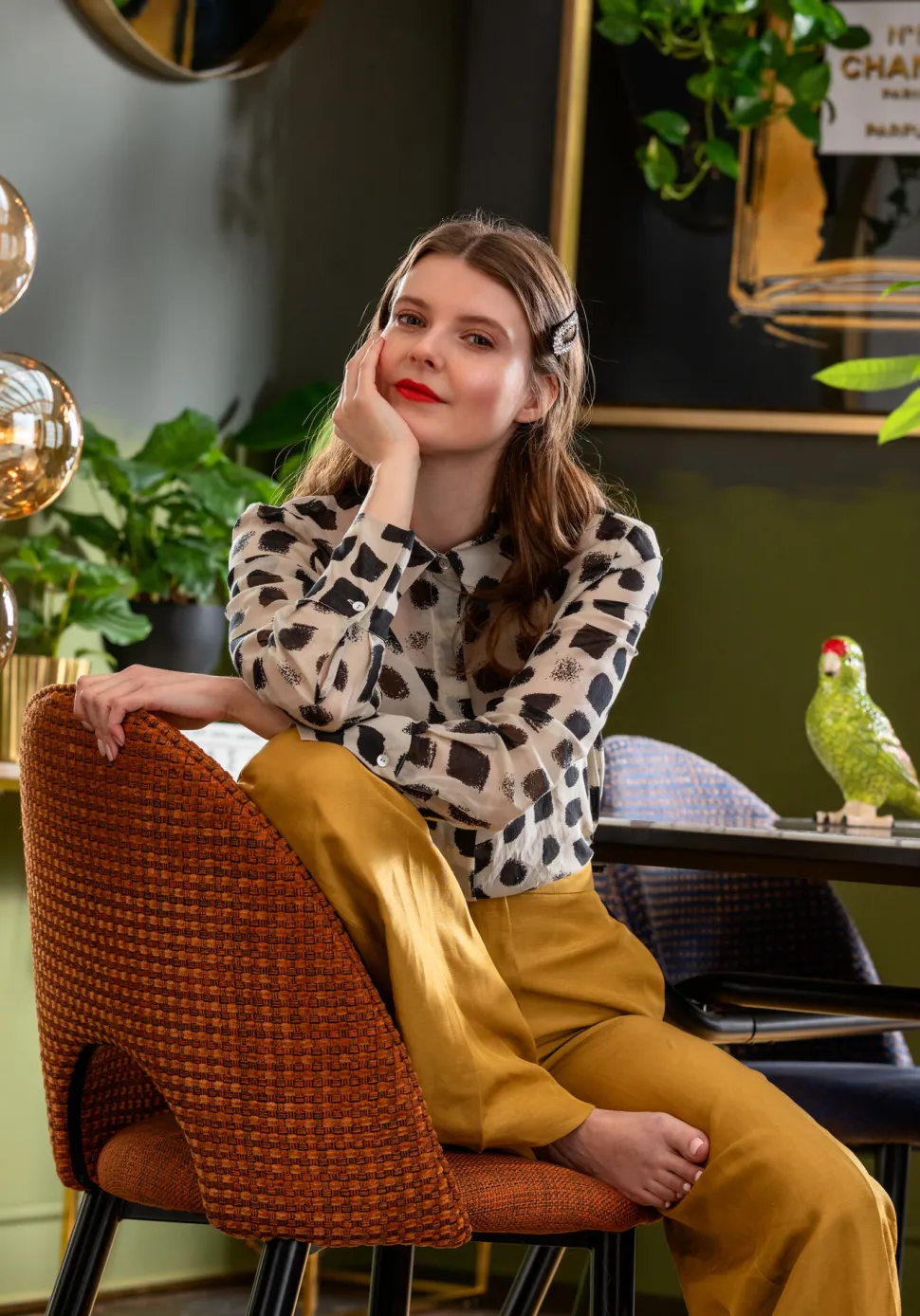 - Blickfänger mit Grandezza: Polsterstuhl mit schwarz lackierten Beinen und Bezügen im Muster-Mix in Terrakotta