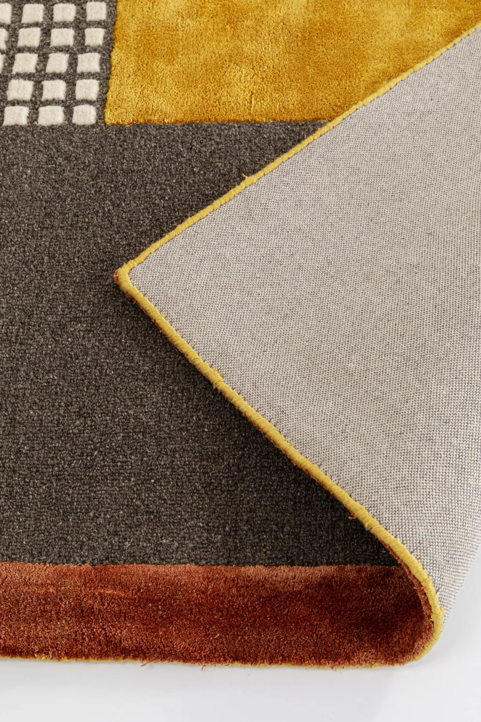 - Dieser Teppich beeindruckt mit seinem abstrakten Design im Patchwork-Stil und warmen Erdtönen