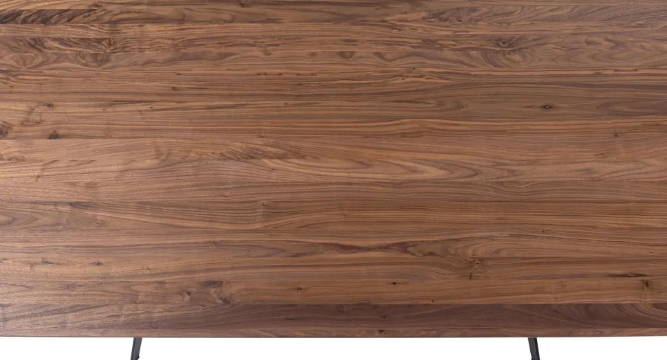 - Rechteckiger Esstisch mit einer hochwertigen Tischplatte aus massivem Walnussholz und dynamisch geformten Stahl-Beinen in Schwarz für ca. 4-6 Personen
