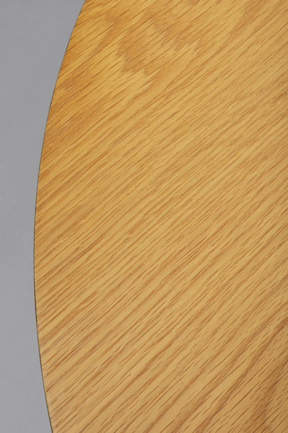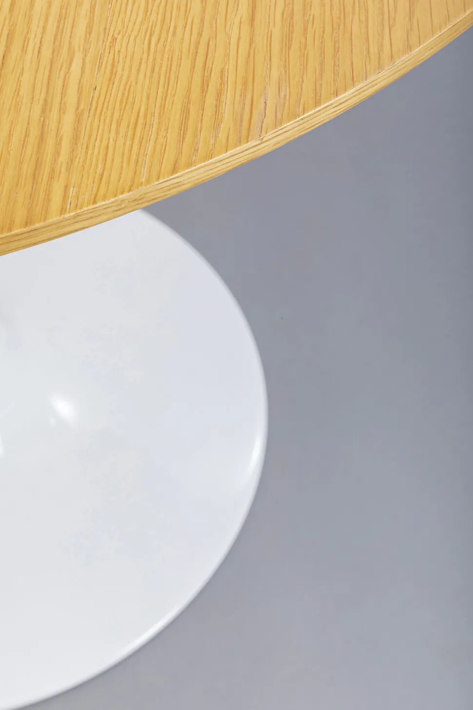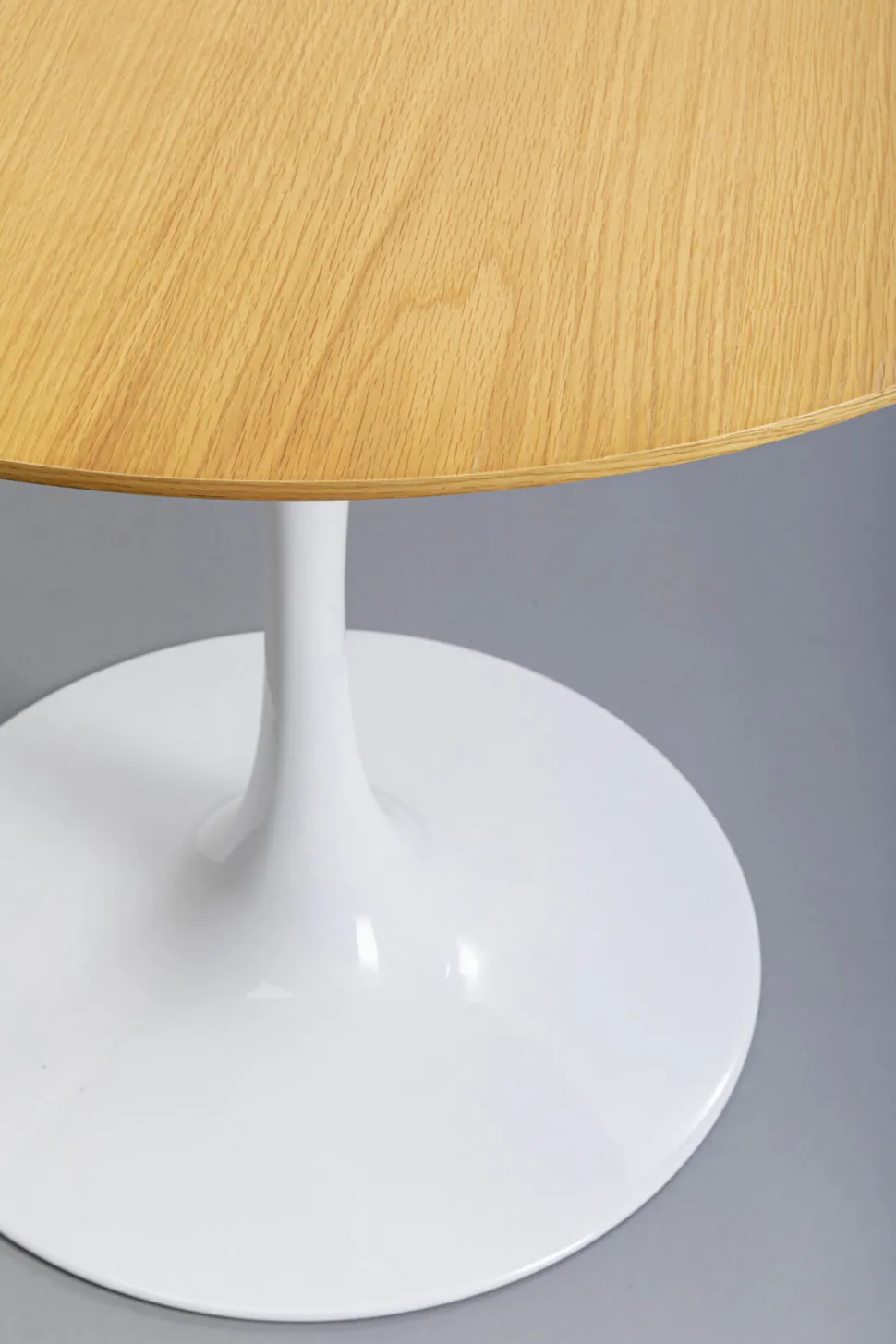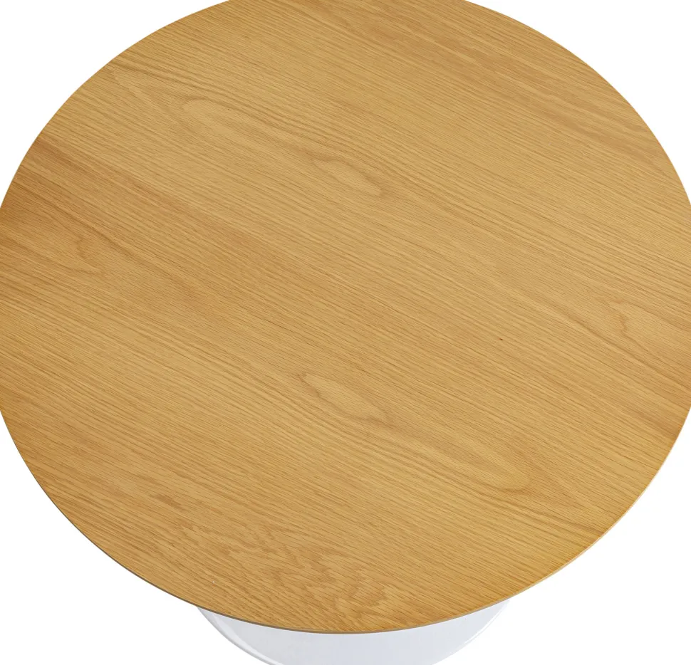 - Moderner, runder Tisch in klassischer Designtradition mit glänzend weißem Metallfuß und einer mit edler Eiche furnierten Tischplatte