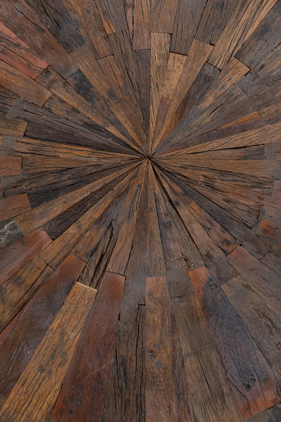 - Das Recyclingholz mit seinen sichtbaren Lebensspuren wird in Kreis- und Strahlenform zu einem wunderschönen Muster zusammengefügt. Magic!