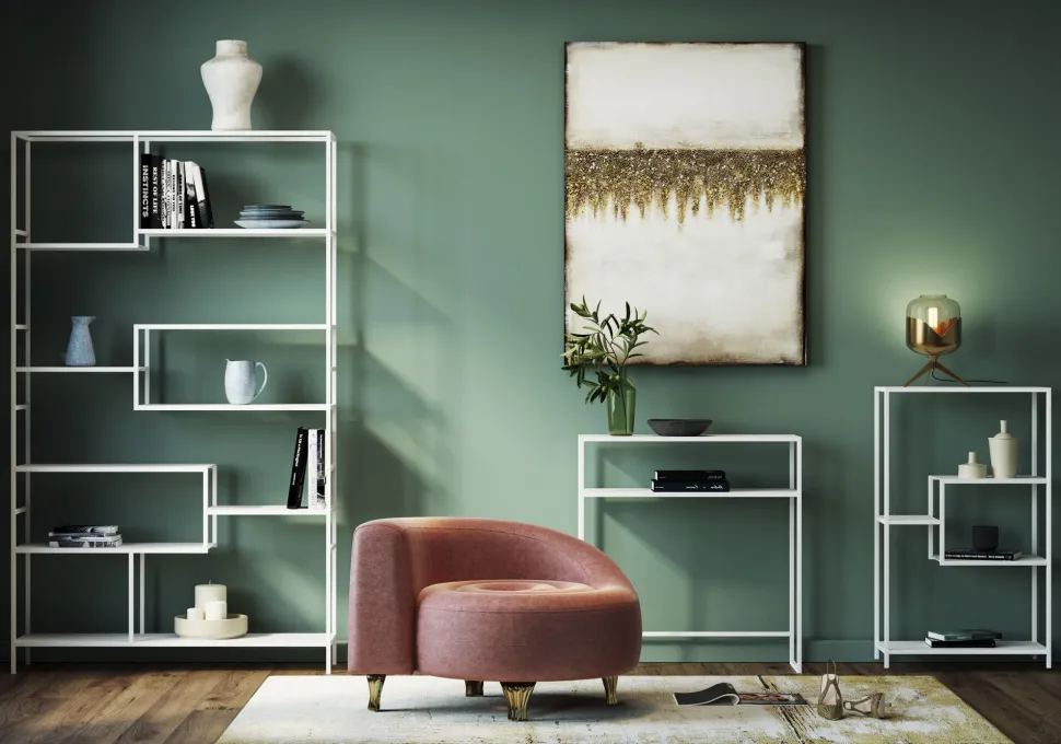 - Das Bildmotiv spielt mit gedämpften, natürlichen Farben in Graublau und Erdtönen