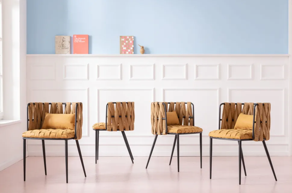 - Gemütlicher Armlehnstuhl, extra stylisch mit Flechtoptik in der Trendfarbe Curry
