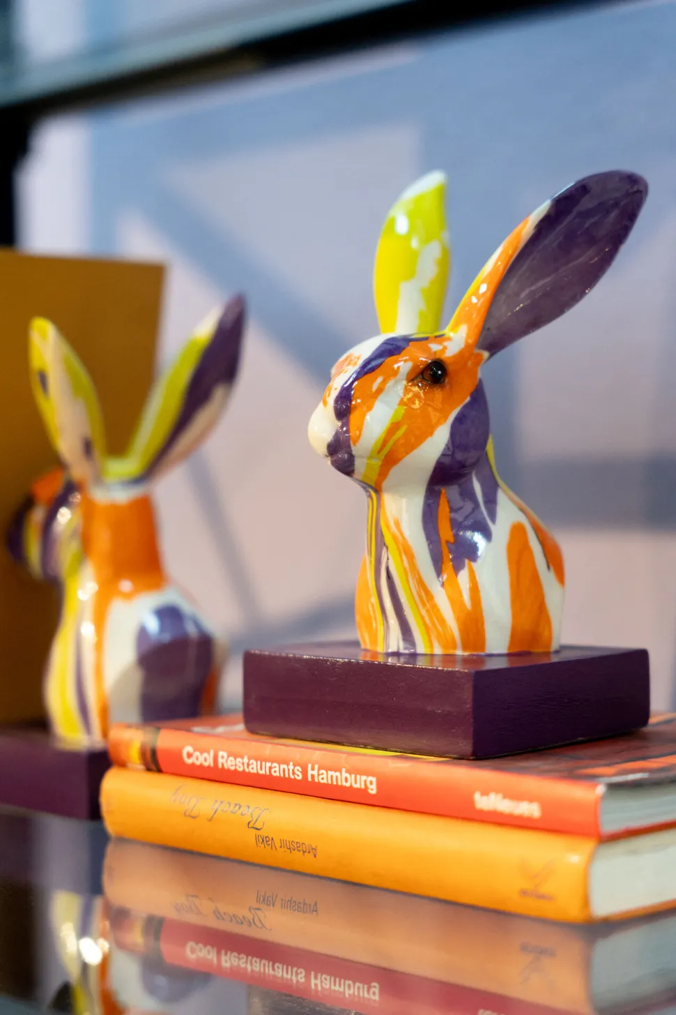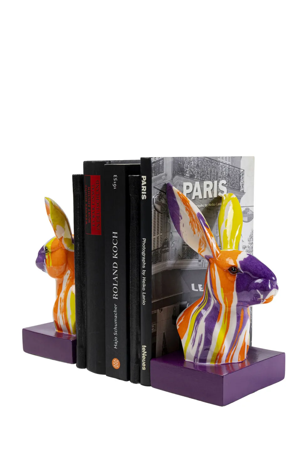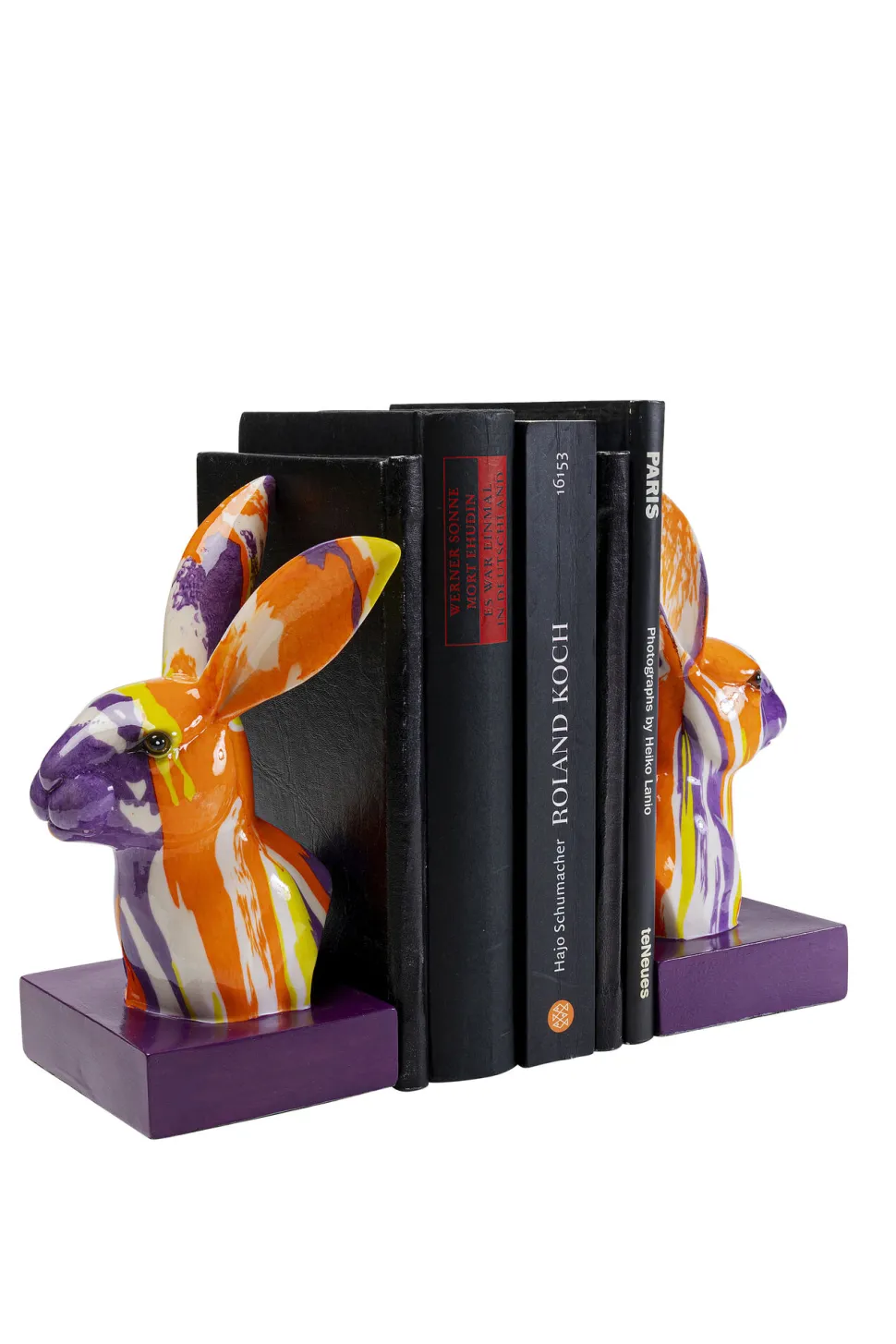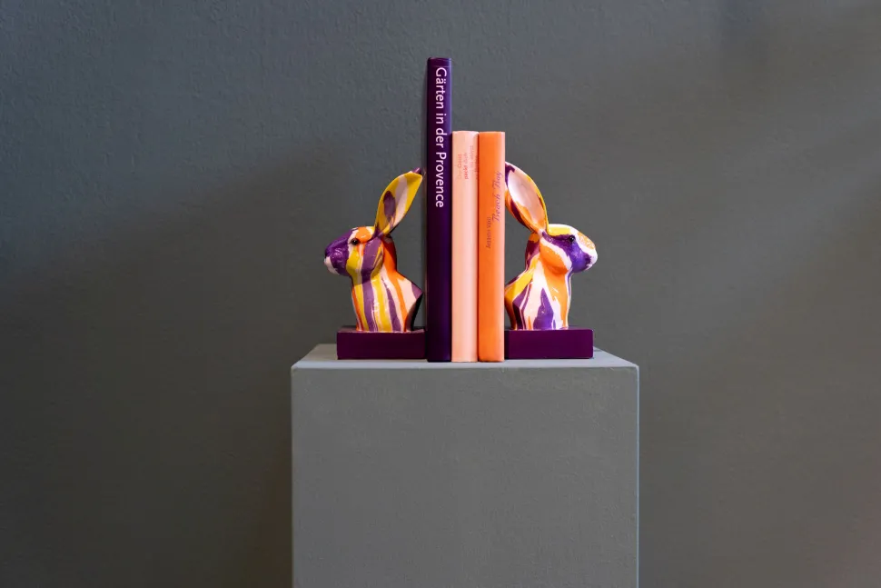 - Buchstützen-Set mit Hasenfiguren in Violett und Orange, 20 x 12 x 10.5 Zentimeter (H/B/T)