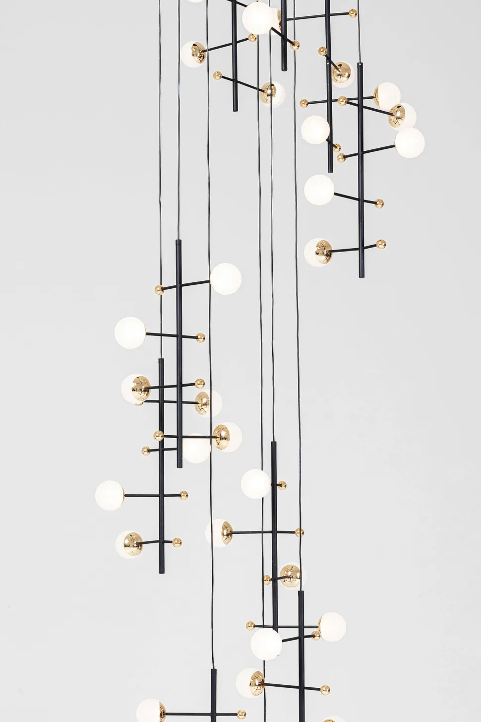 - Die Länge dieser modernen Leuchten-Skulptur lässt sich individuell anpassen von ca. 100 bis 180 Zentimeter