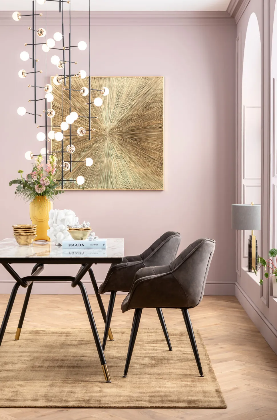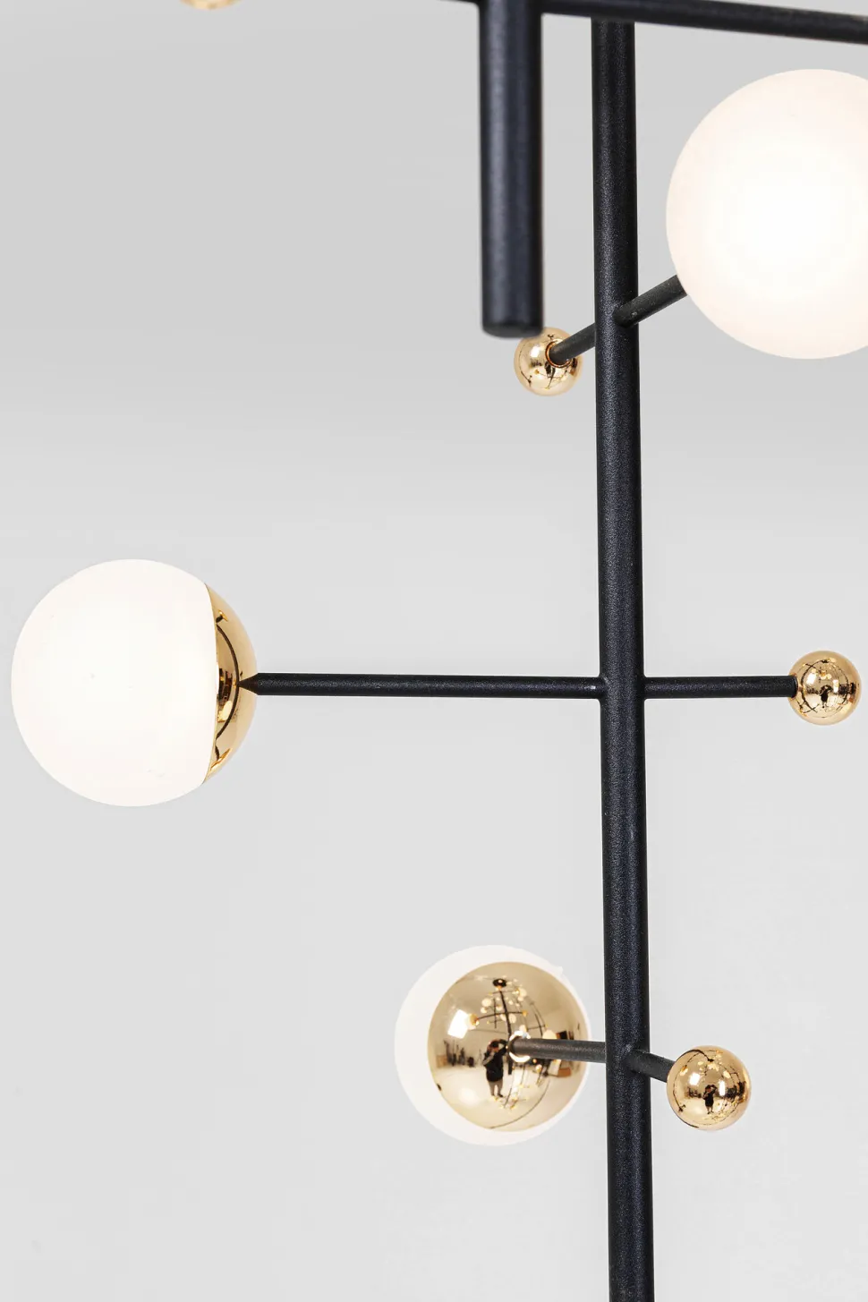 - Schwarze Designer-Leuchte im XL Format mit weißen Kugelleuchten, die indirektes Licht spenden. Glanzvoll: die kleinen, goldenen Dekor-Kügelchen