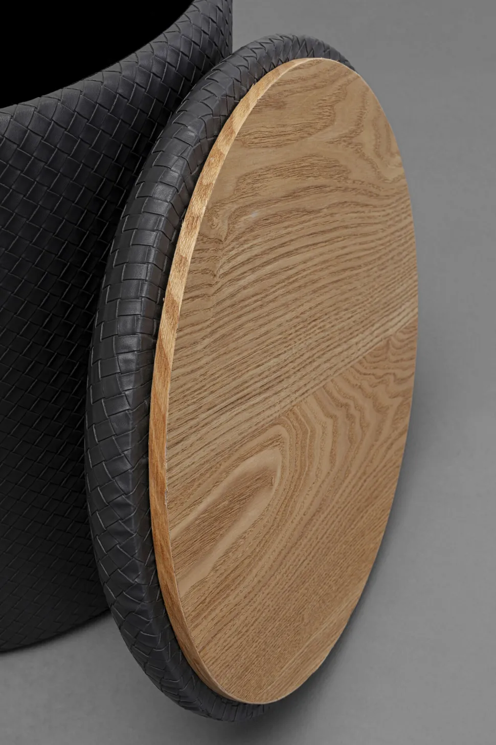 - Der Sitzhocker überzeugt mit seinem schwarzen, geflochtenen Kunstlederbezug und schlichter, abgerundeter Form