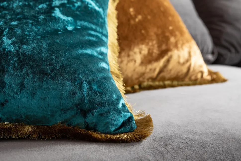 - Eine extravagante Fransenkante ziert das samtweiche Kissen in trendigem Blaugrün
