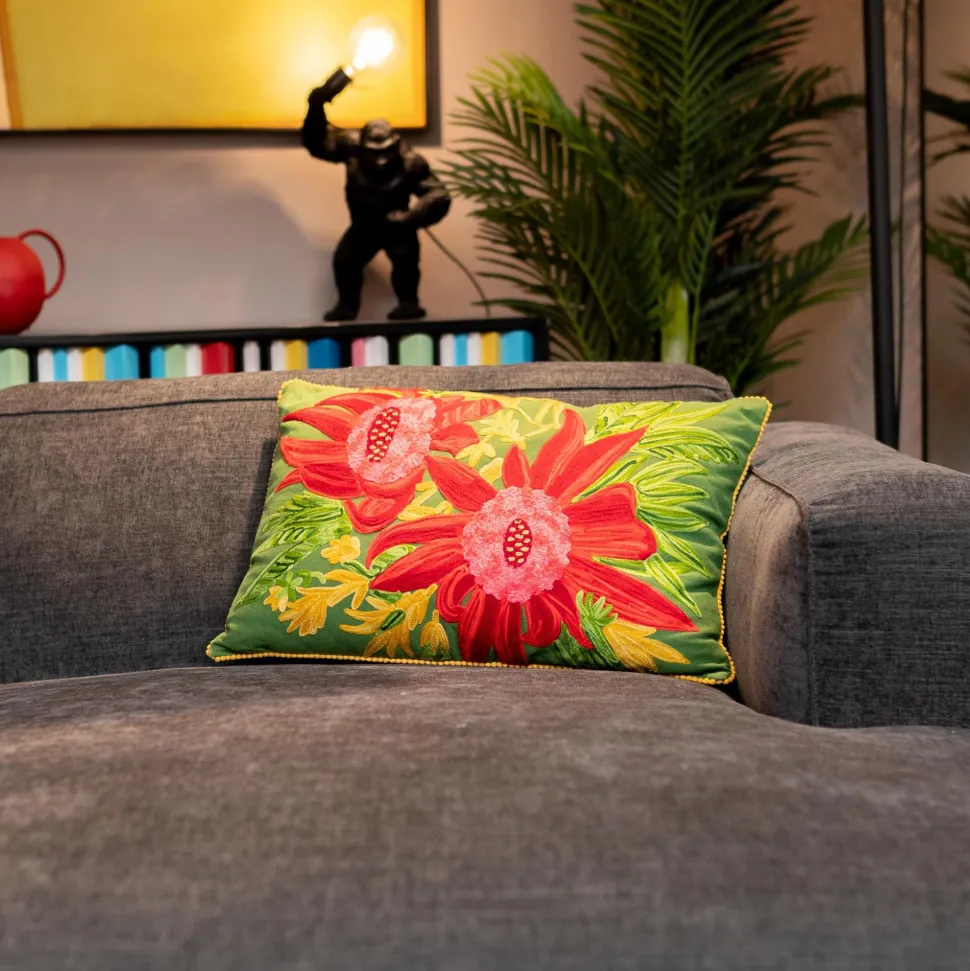 - Das Dekokissen setzt mit strahlenden Farben und floralen Motiven lebendige Akzente