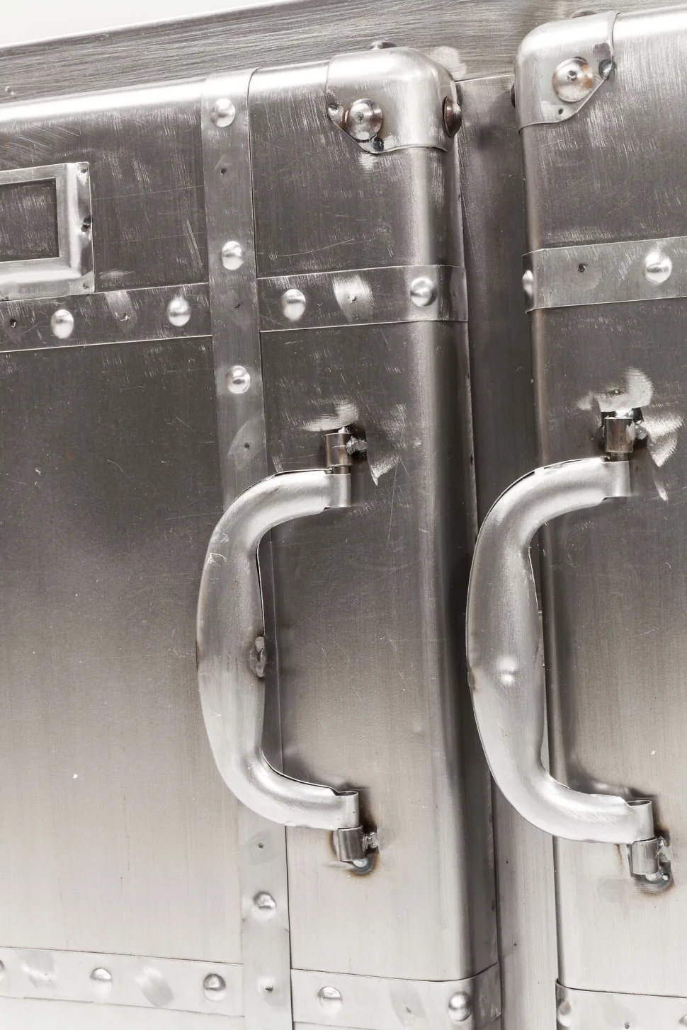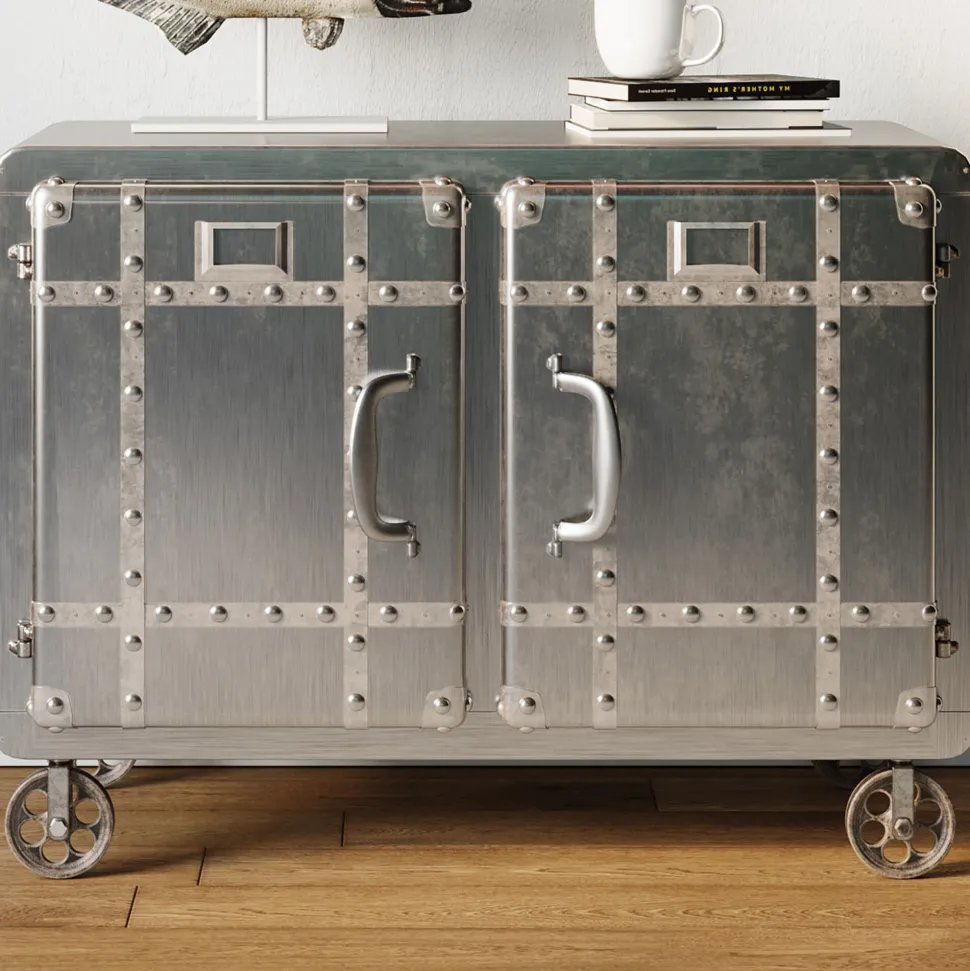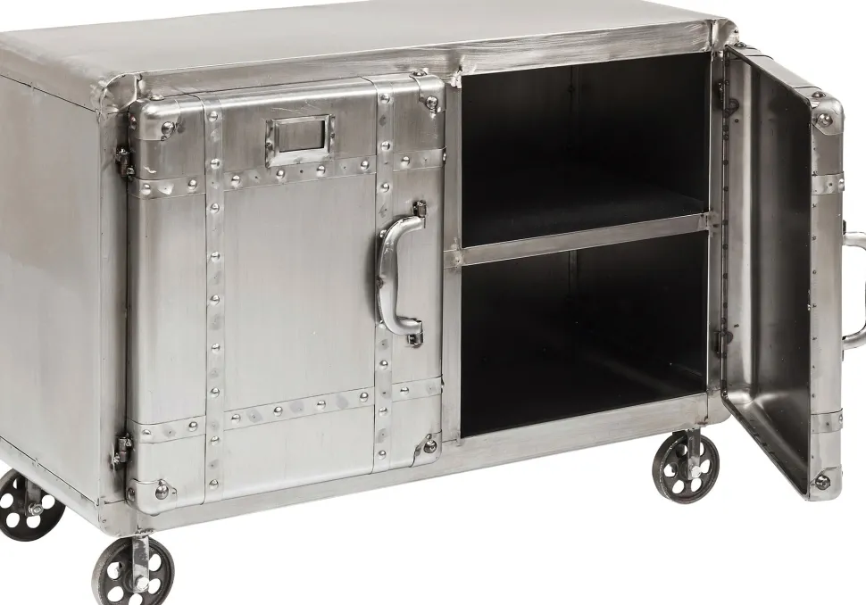 - Rechteckige, kompakte Kommode aus Stahl im Vintage-Look auf vier Rollen mit Schweißnähten und zwei großen Ablageflächen hinter den beiden Türen