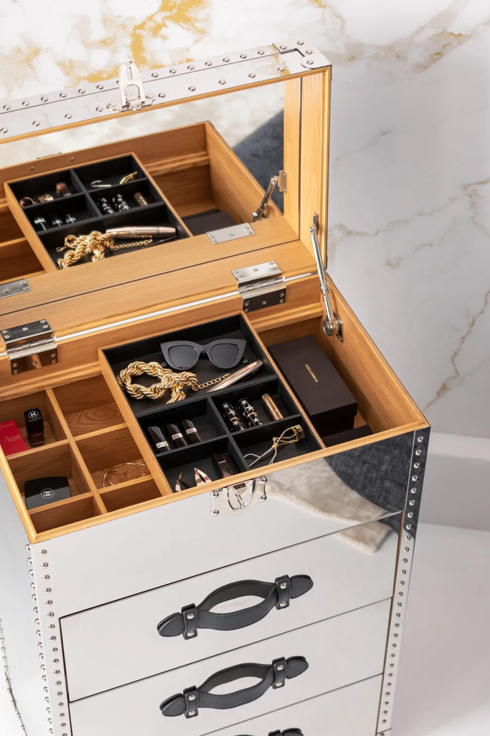 - Unterhalb des Spiegels finden Sie praktische Fächer und Einteilungen für Kleinkram
