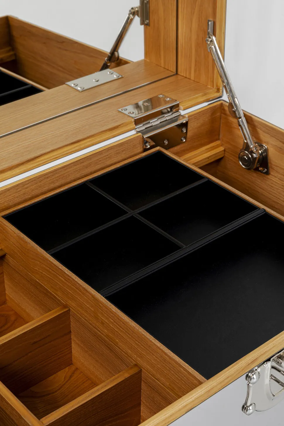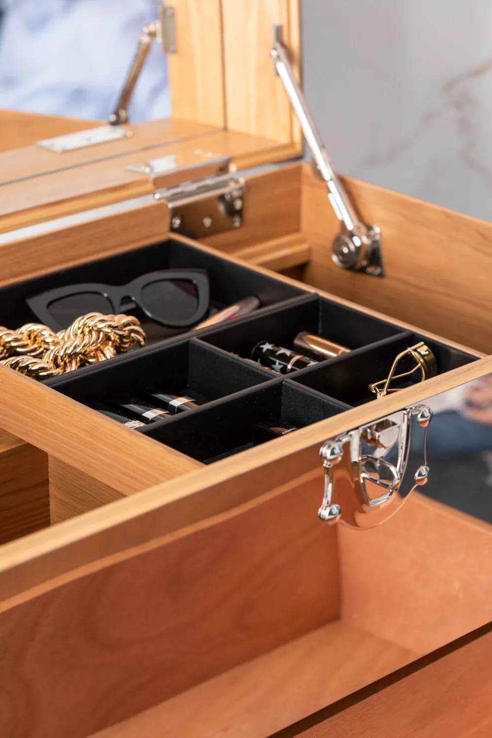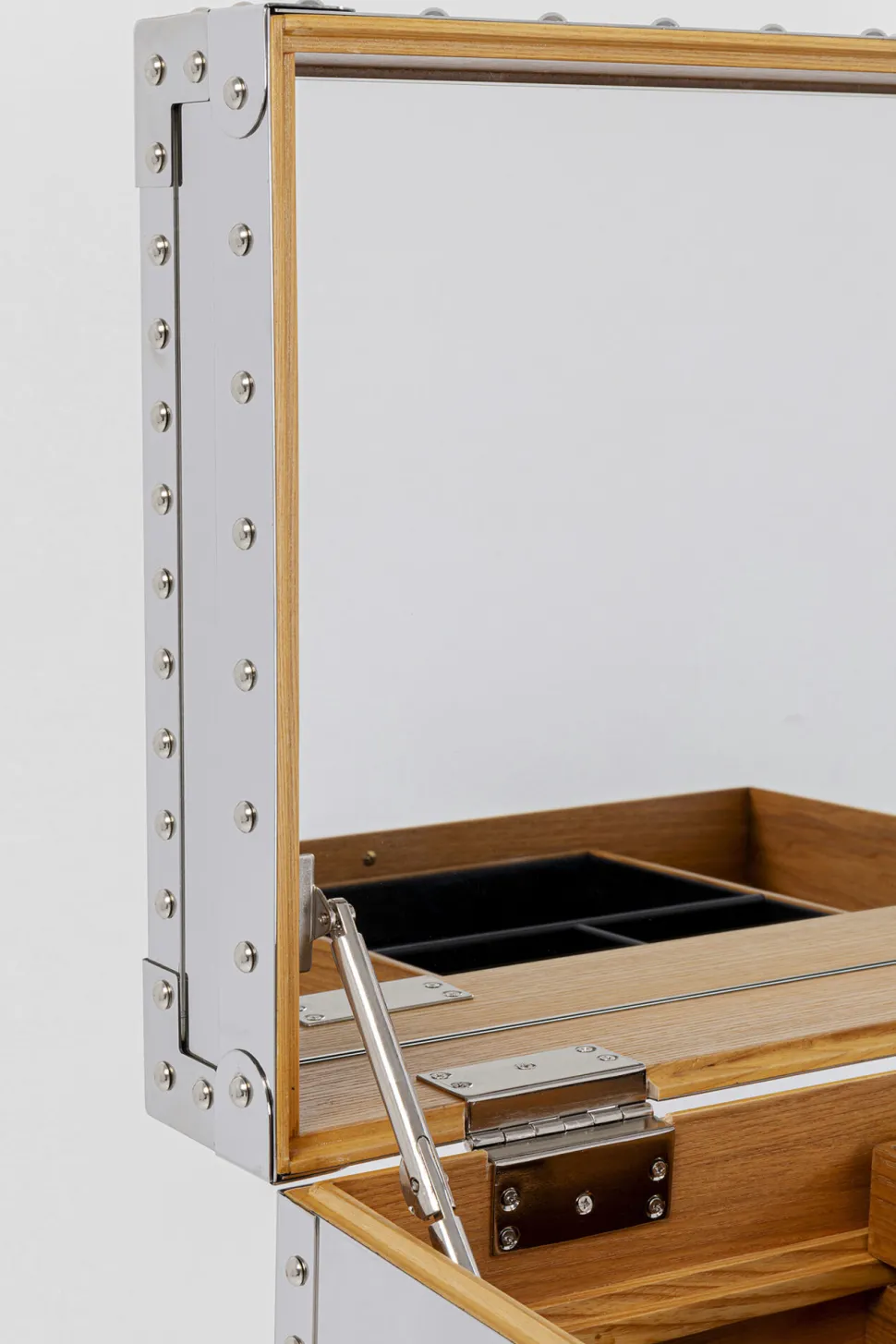 - Der aufklappbare Deckel des Schminktisches ist mit einem Spiegel ausgestattet