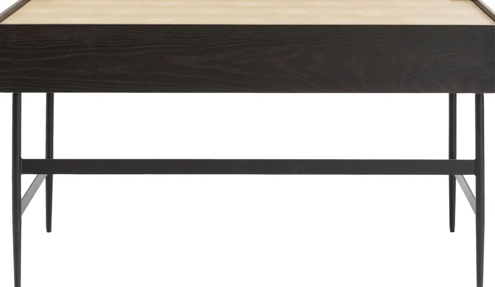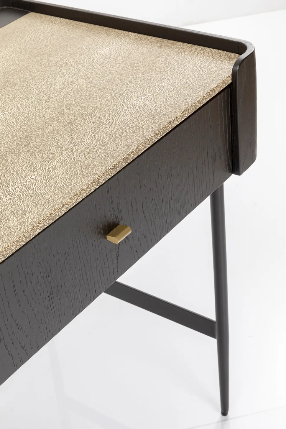 - Charaktervoll: die Kombination von dunklem, schwarz-braunem Eichenholz-Furnier mit den cremefarbenen Bezügen in feiner Rochenhaut-Optik