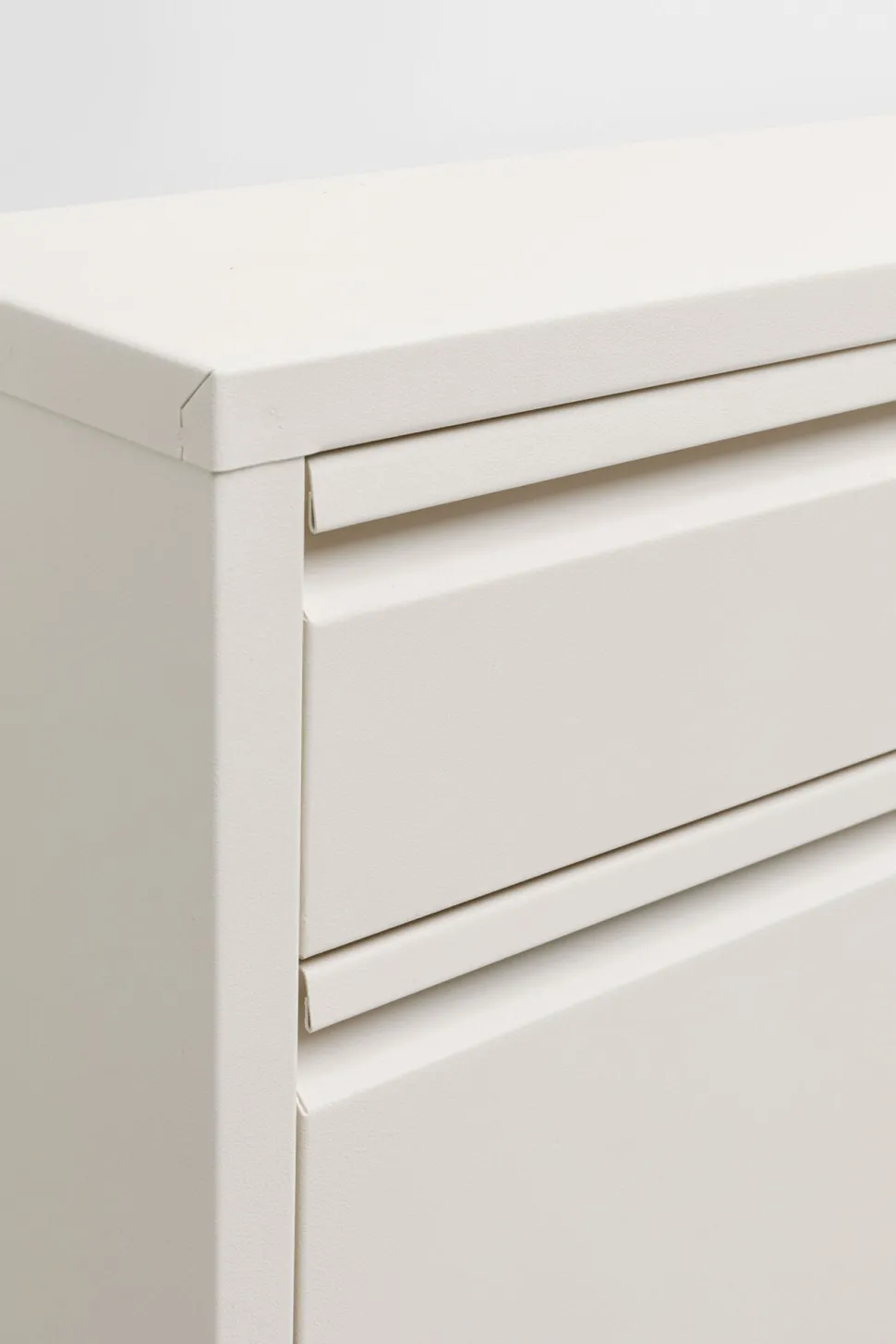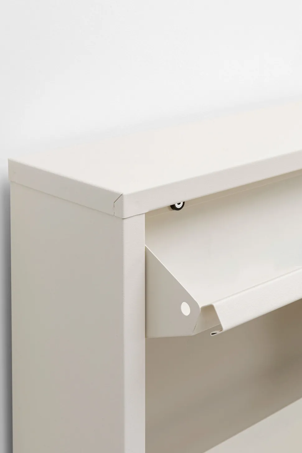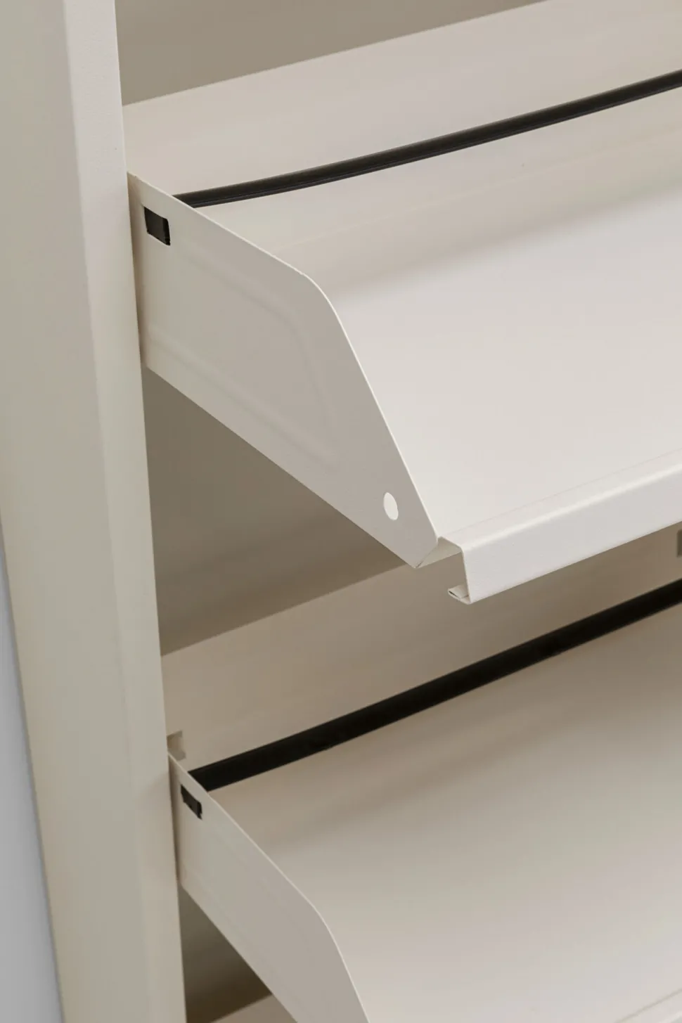 - Praktischer, cremefarbener Schuhschrank aus Metall mit drei Kippfächern und extra Schubfach