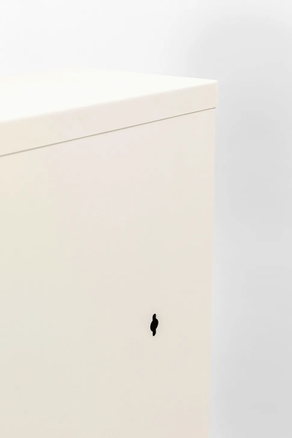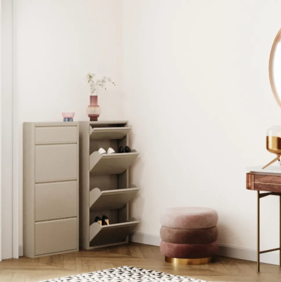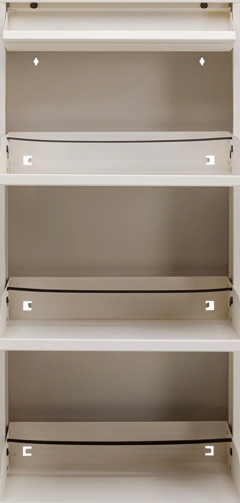 - Praktischer, cremefarbener Schuhschrank aus Metall mit drei Kippfächern und extra Schubfach