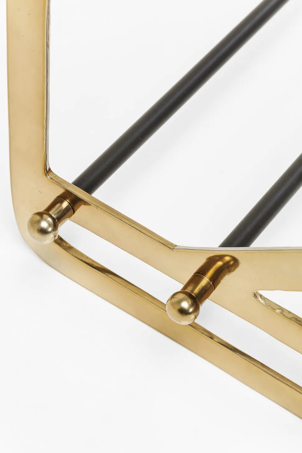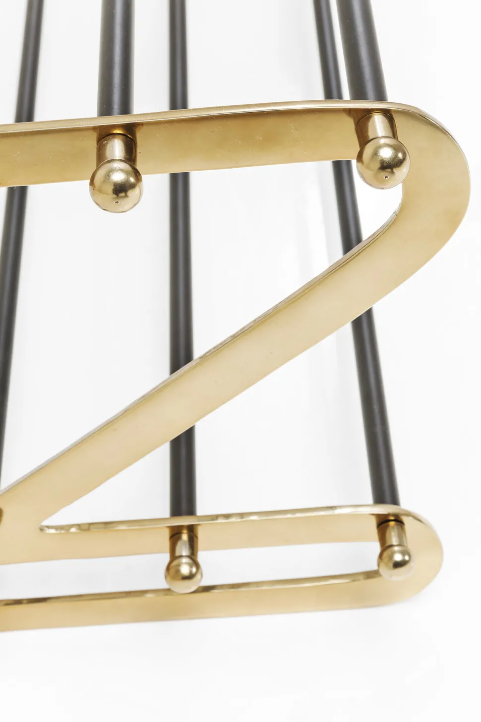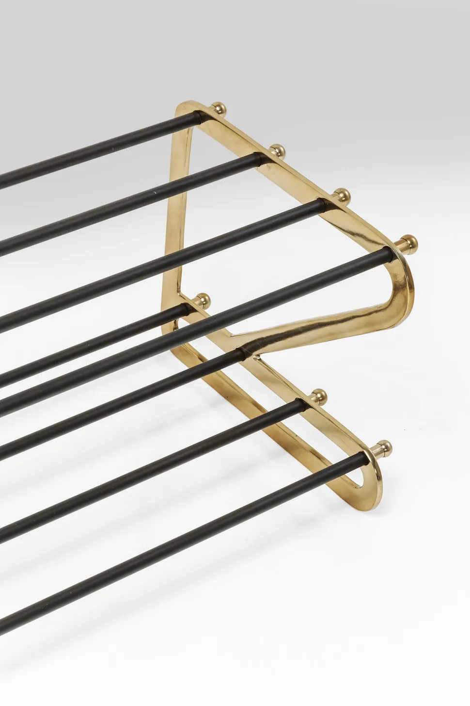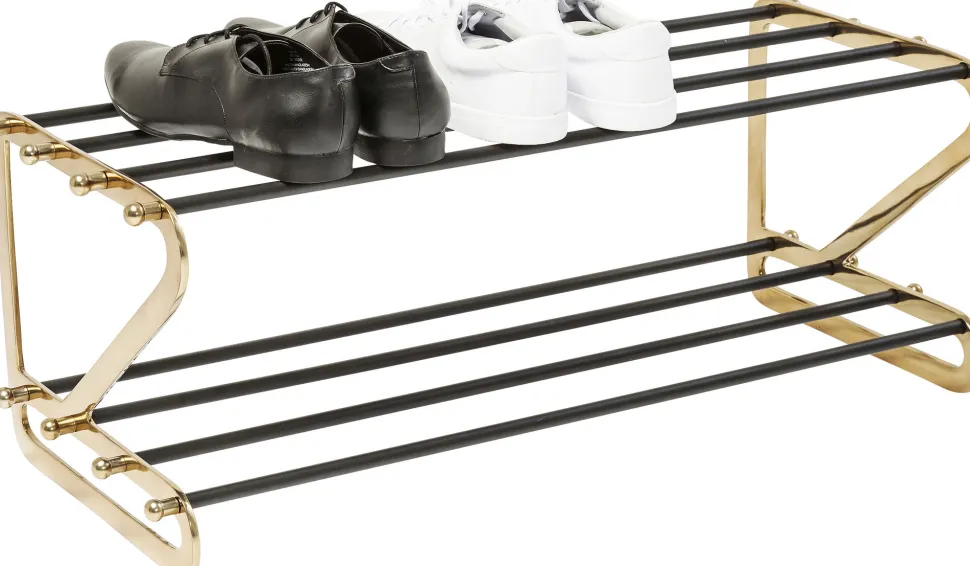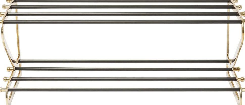 - Schuhregal aus Stahl mit Glam-Faktor, lackiert in Schwarz und Gold und mit hübschen Zierelementen