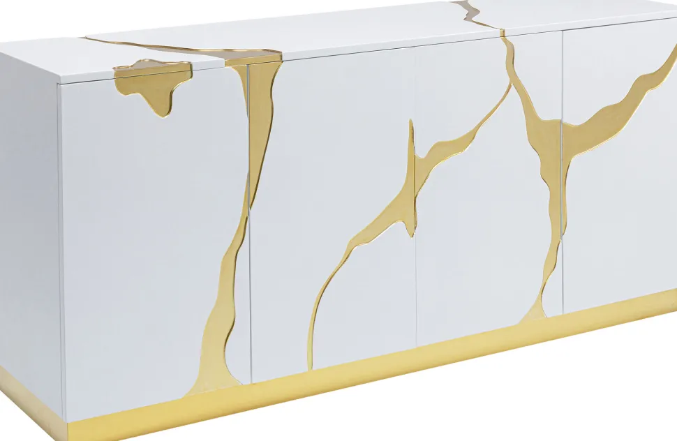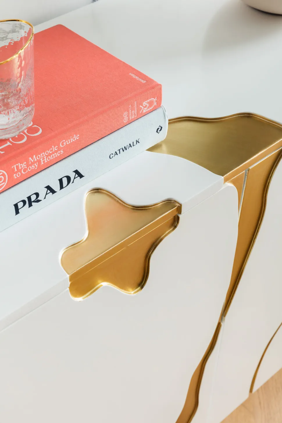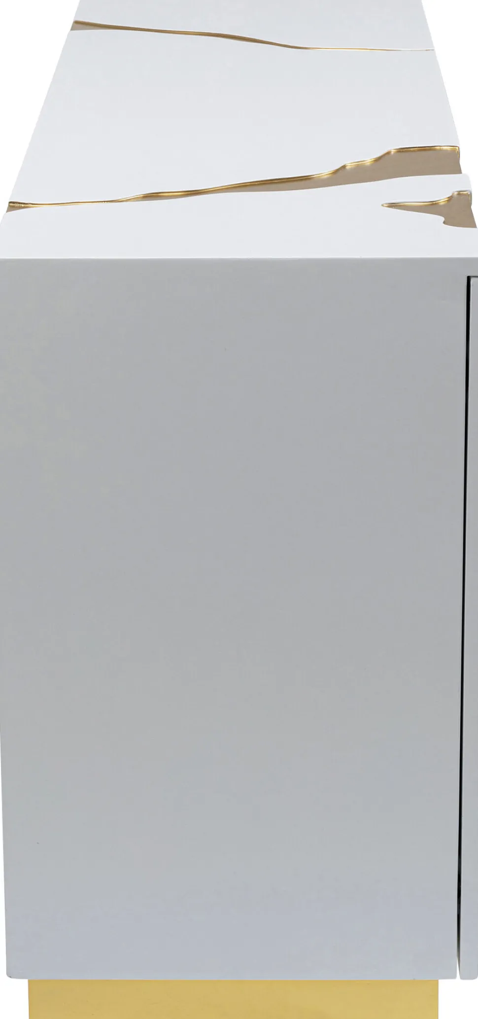 - Weißes, modernes Designer-Sideboard mit eingravierten Verzierungen in Gold auf den Fronten der Türen und auf der Oberseite