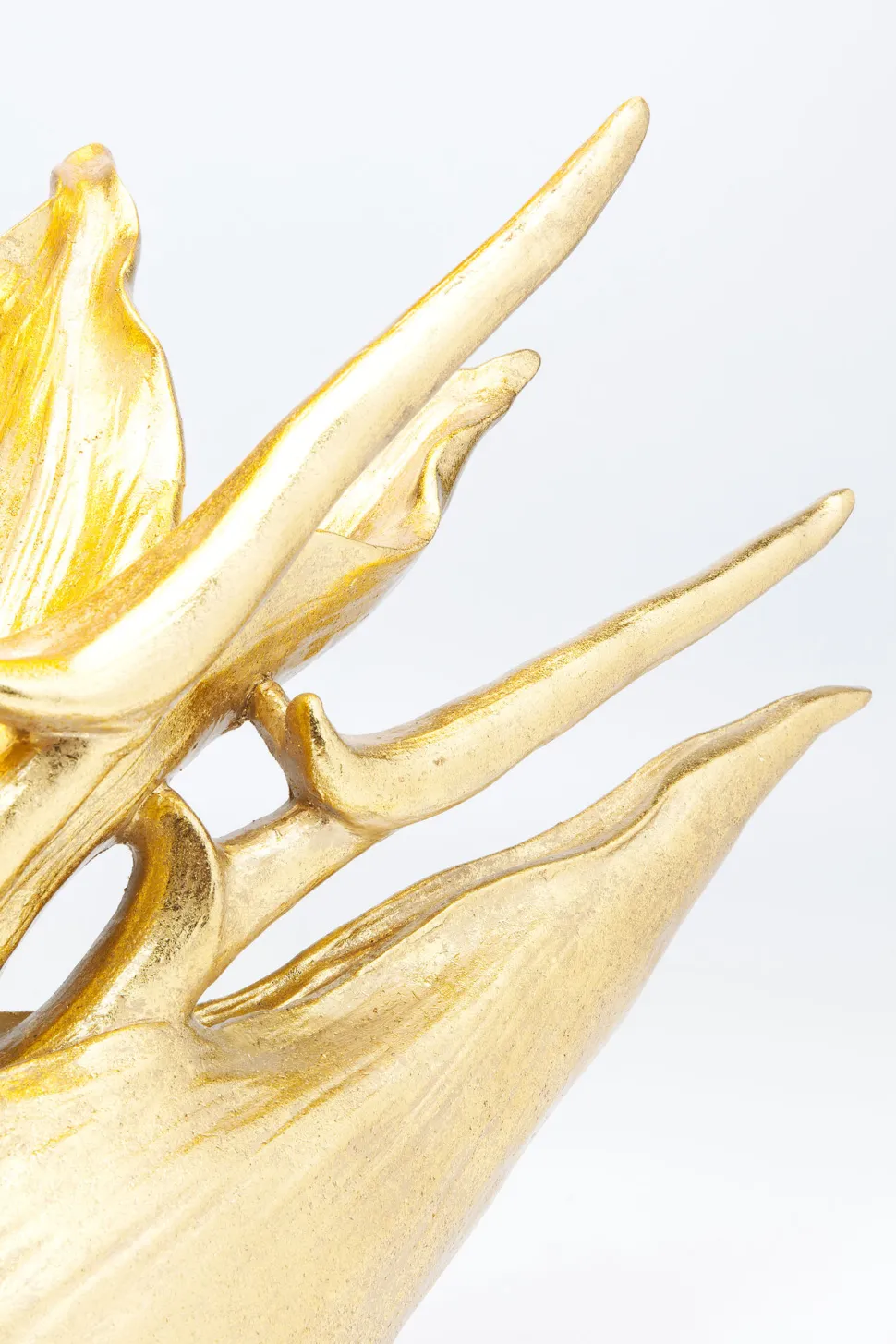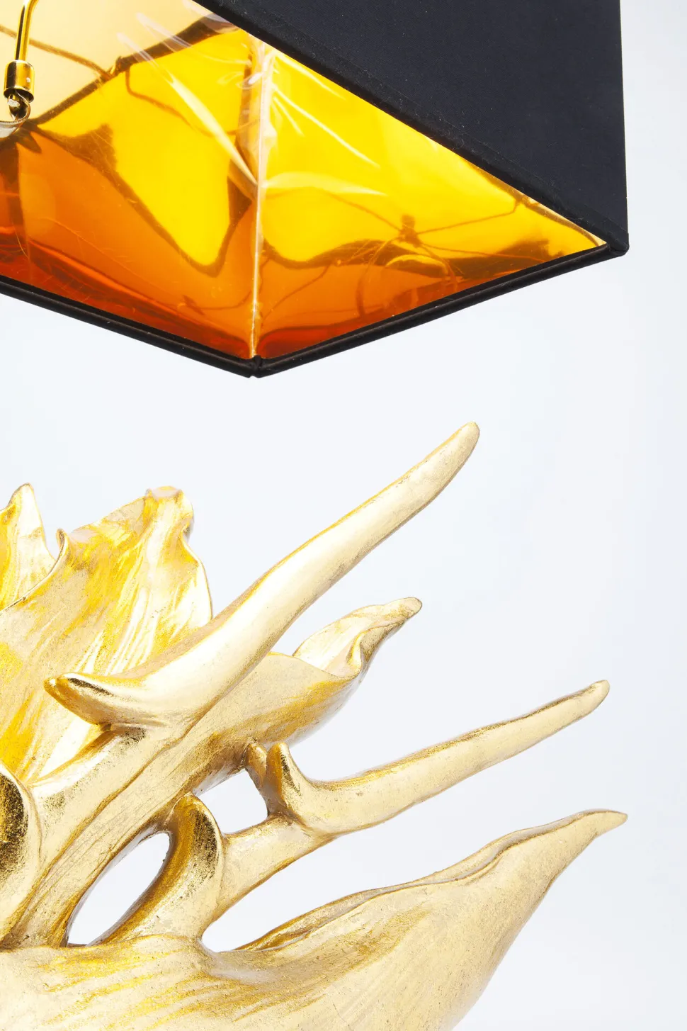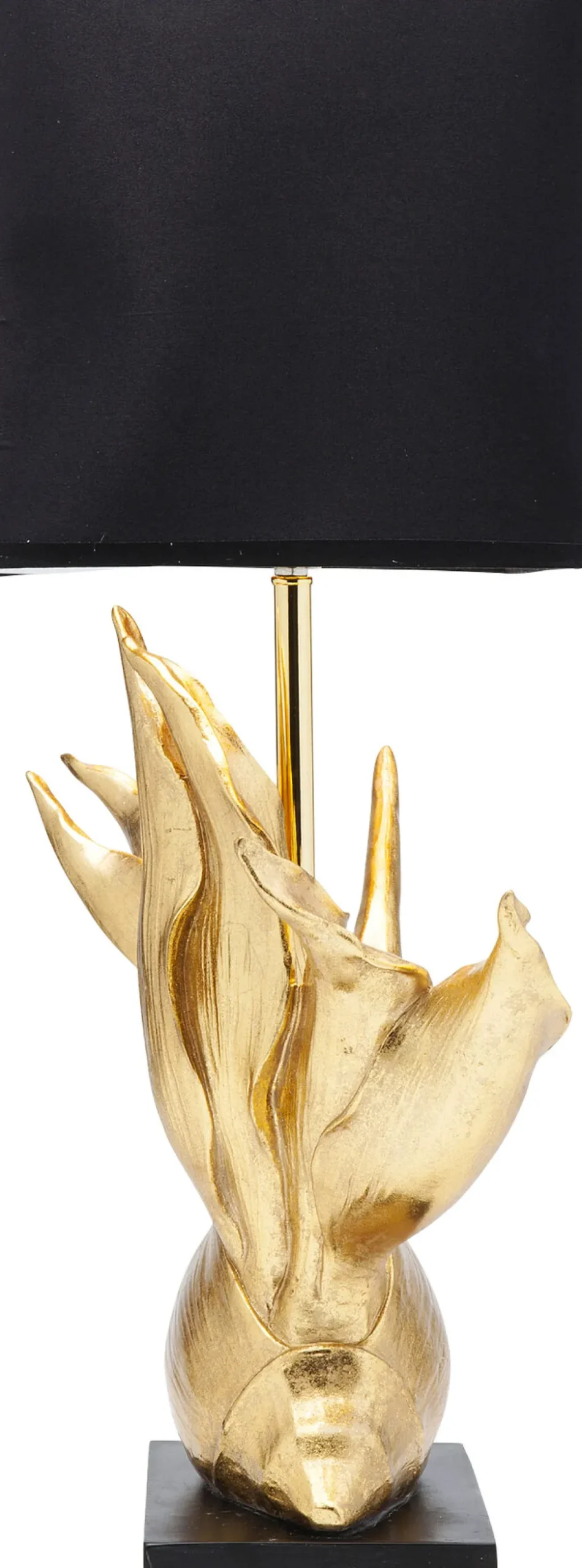 - Eine Tischleuchte in Gold und Schwarz, die mit dem aufwändig gearbeiteten Fuß wie ein Kunstobjekt wirkt